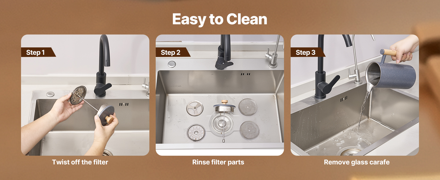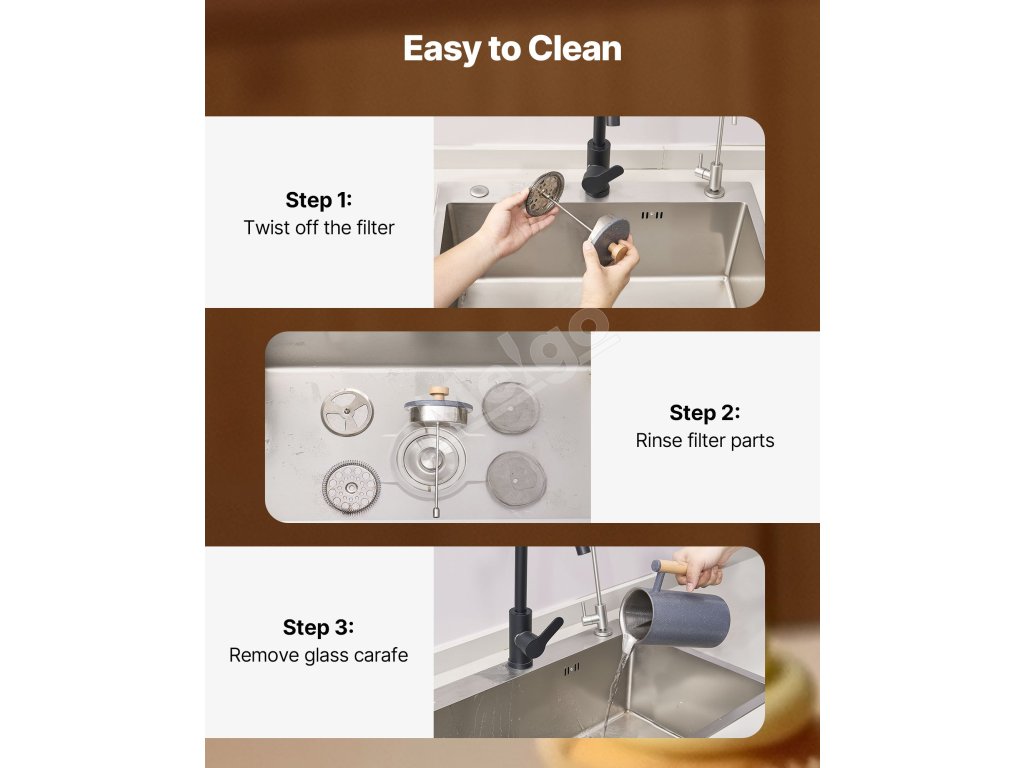 Odnímateľná konštrukcia umožňuje dôkladné čistenie - stačí ju hodiť do umývačky riadu. Každá časť, od sklenenej karafy až po filter, sa dá ľahko rozobrať a nezanecháva za sebou kávu ani oleje.