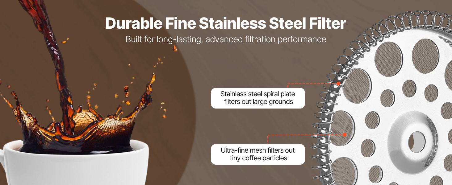 Vysokohustotný sieťový filter z nehrdzavejúcej ocele účinne blokuje kávovú usadeninu, čím poskytuje čistú a jemnú kávu. Vyrobené z potravinárskej nehrdzavejúcej ocele 304 - odolné proti korózii a ľahko sa čistí, aby ste zakaždým pripravili kávu s čerstvou chuťou.