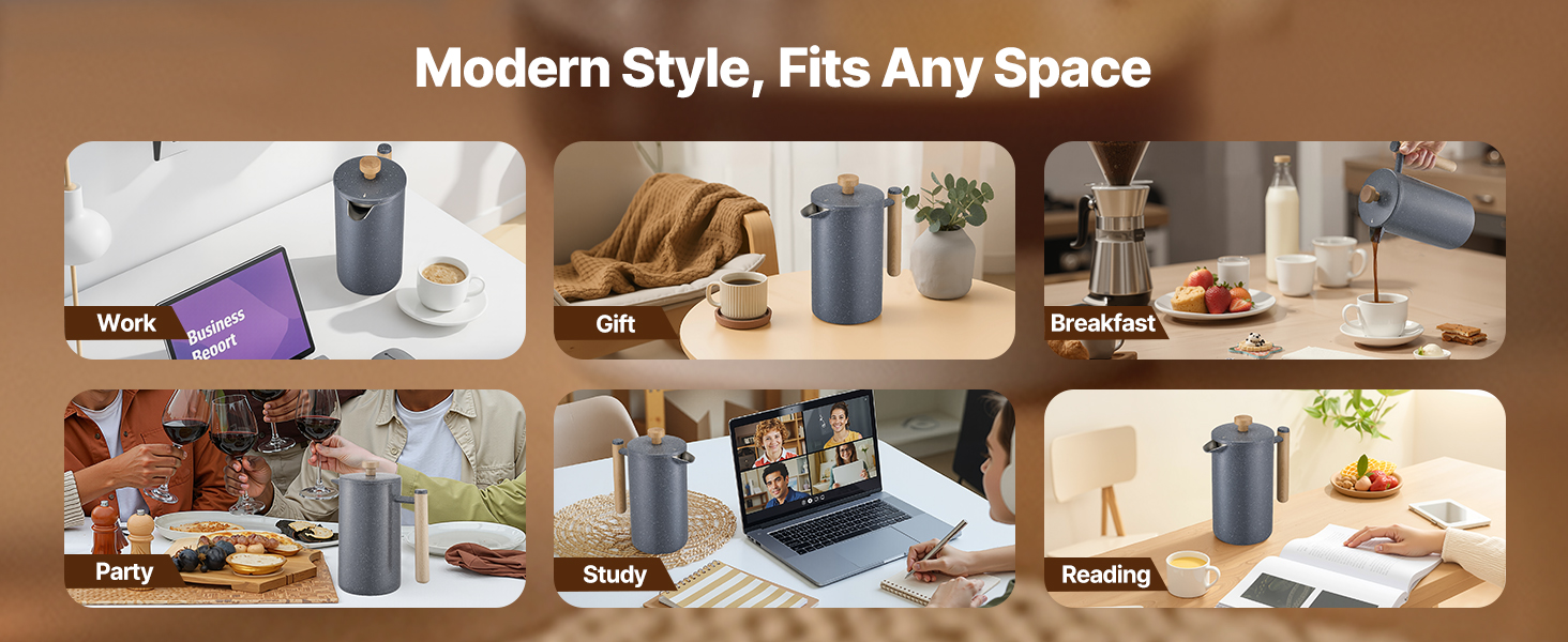 Vďaka svojmu elegantnému, nadčasovému dizajnu sa tento kávovar French press bez problémov začlení do akéhokoľvek prostredia - či už je to kancelária, kuchyňa alebo pracovňa - takže si môžete vychutnať lahodnú kávu kedykoľvek a kdekoľvek.