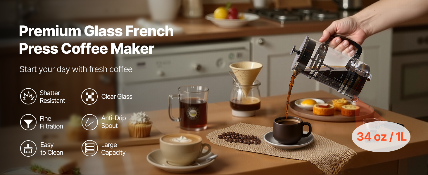 French press kávovar je vyrobený z prvotriedneho borosilikátového skla, ktoré poskytuje vynikajúcu viditeľnosť a umožňuje sledovať prípravu kávy v reálnom čase. Výlevka proti odkvapkávaniu zaisťuje vždy hladké nalievanie bez neporiadku.