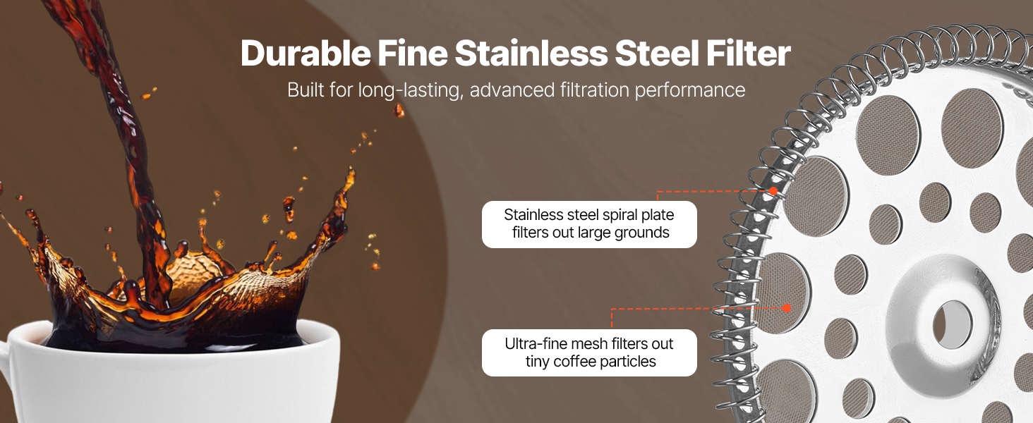 Vysokohustotný sieťový filter z nehrdzavejúcej ocele účinne blokuje kávovú usadeninu, čím poskytuje čistú a jemnú kávu. Vyrobený z potravinárskej nehrdzavejúcej ocele 304 - odolný proti korózii a ľahko sa čistí, aby ste zakaždým pripravili kávu so sviežou chuťou.