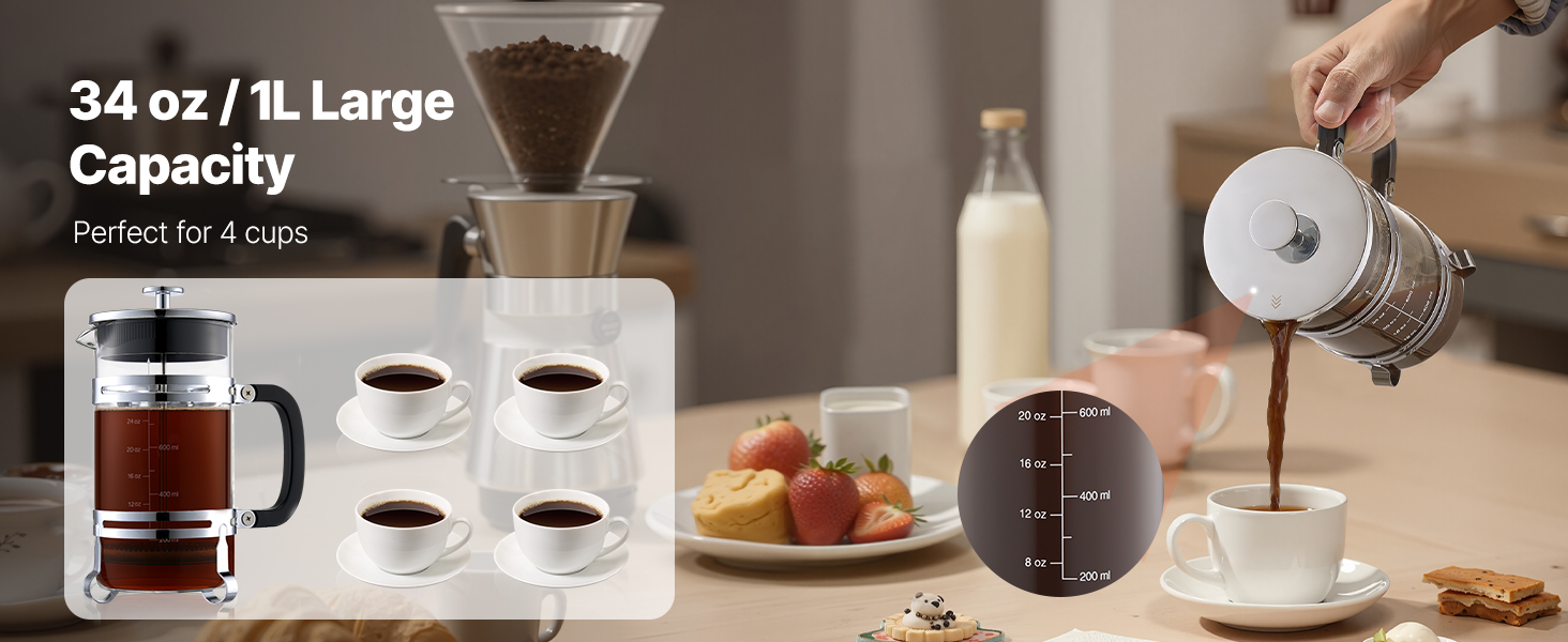 S týmto veľkoryso dimenzovaným french pressom môžete variť kávu pre skupinu. Jasné meracie značky uľahčujú nastavenie objemu varenia podľa vašich potrieb - ideálne na stretnutia aj každodenné používanie.