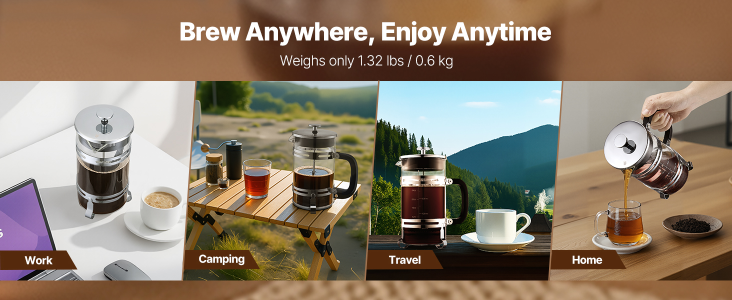 Tento kompaktný a prenosný kávovar french press premení akýkoľvek priestor na váš osobný nápojový kútik - od domácej kancelárie alebo pracovne až po útulný kemp. Vychutnajte si kávu v kaviarenskej kvalite, nech ste kdekoľvek.