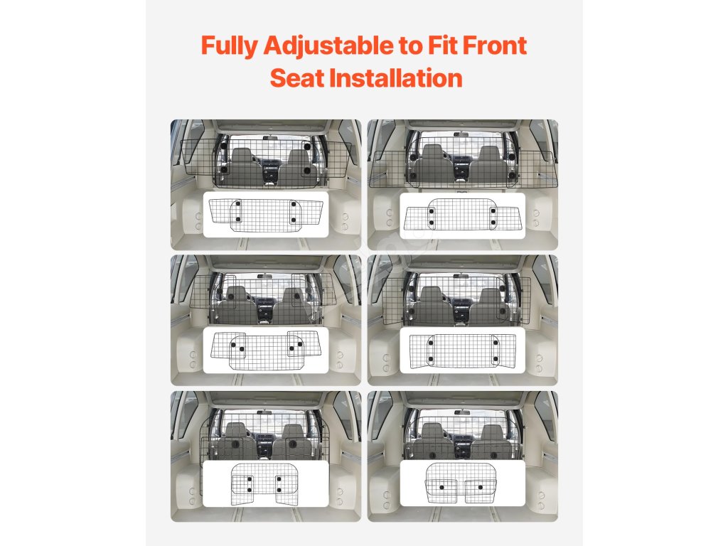 Táto zábrana pre psov pre vozidlá SUV poskytuje až 6 kombinácií tvarov, ktoré sa rozširujú až na 60,6 palca (1539 mm). Ľahko ju nastavíte a rozšírite tak, aby sa zmestila do rôznych vozidiel SUV, dodávok, džípov a hatchbackov.
