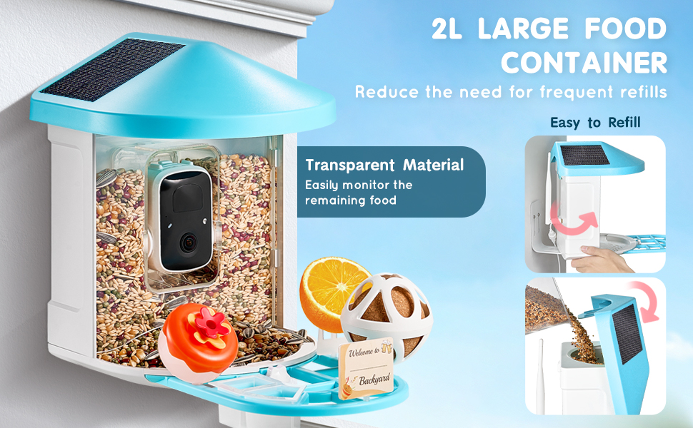 Toto vonkajšie kŕmidlo pre vtáky je vybavené 2 l veľkou nádobou na krmivo, ktorá uľahčuje sledovanie zostávajúceho krmiva a znižuje problémy s častým dopĺňaním. Krmivo doplníte len v 3 krokoch, čím prilákate viac vtákov a vnesiete do svojej záhrady pulzujúci život.