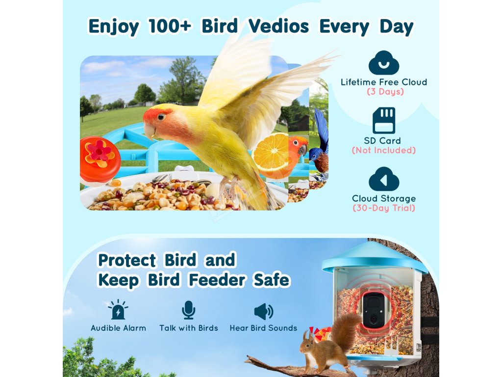 Už sa nemusíte obávať, že veveričky ukradnú vtáčie krmivo! Inteligentné kŕmidlo pre vtáky s umelou inteligenciou je vybavené zvukovým alarmom a obojsmerným zvukom, ktorý umožňuje počúvať zvuky vtákov, rozprávať sa s vtákmi a odháňať otravné veveričky, čím zabezpečuje bezpečnosť kŕmidla a ochranu vtáčej potravy.