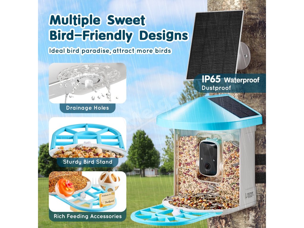 Inteligentné kŕmidlo pre vtáky VEVOR s kamerou s rozlíšením 2K HD so širokým uhlom záberu 145° a plnofarebným nočným videním poskytuje ohromujúcu čistotu a detaily. Vďaka rozpoznávaniu AI a stabilnému pripojeniu Wi-Fi 2,4 GHz môžete sledovať svojich operených návštevníkov v reálnom čase a užívať si bližšie spojenie s prírodou.