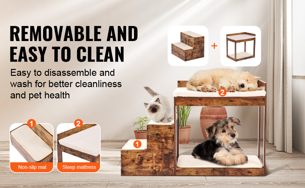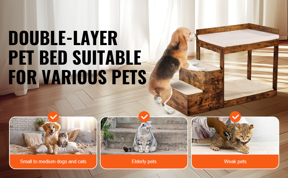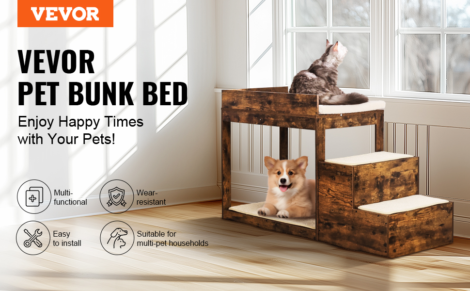 Dvojposchodová posteľ pre domáce zvieratá VEVOR je multifunkčný výrobok kombinujúci dvojposchodovú posteľ pre domáce zvieratá a lezeckú plošinu pre domáce zvieratá, ktorý sa vyznačuje priestrannosťou, protišmykovosťou a odolnosťou proti opotrebovaniu a trvanlivosťou, čo umožňuje vašim domácim zvieratám pohodlne, bezpečne a jednoducho vyliezť a odpočívať.