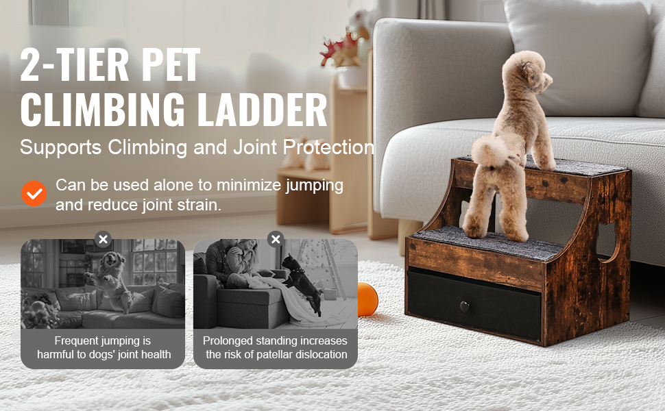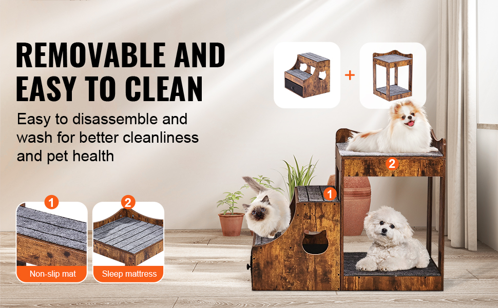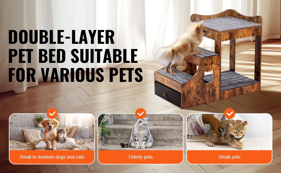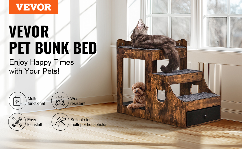 Dvojposchodová posteľ pre domáce zvieratá VEVOR je multifunkčný výrobok kombinujúci dvojposchodovú posteľ pre domáce zvieratá a lezeckú plošinu pre domáce zvieratá, ktorý sa vyznačuje priestrannosťou, protišmykovosťou a odolnosťou proti opotrebovaniu a trvanlivosťou, čo umožňuje vašim domácim zvieratám pohodlne, bezpečne a jednoducho vyliezť a odpočívať.