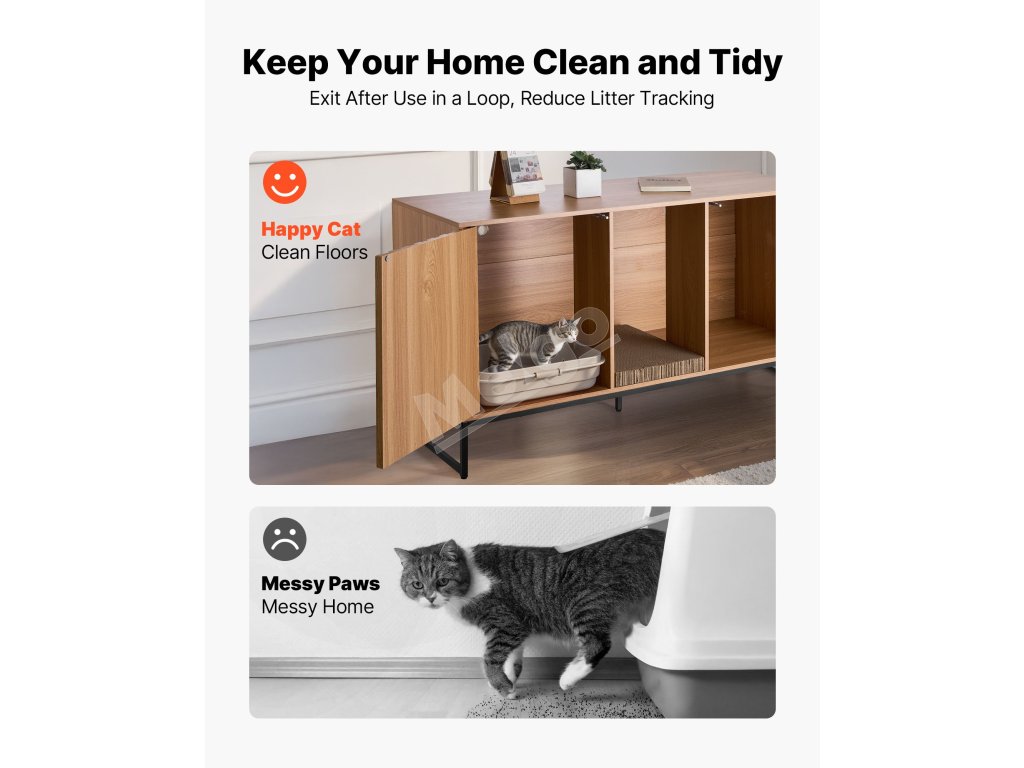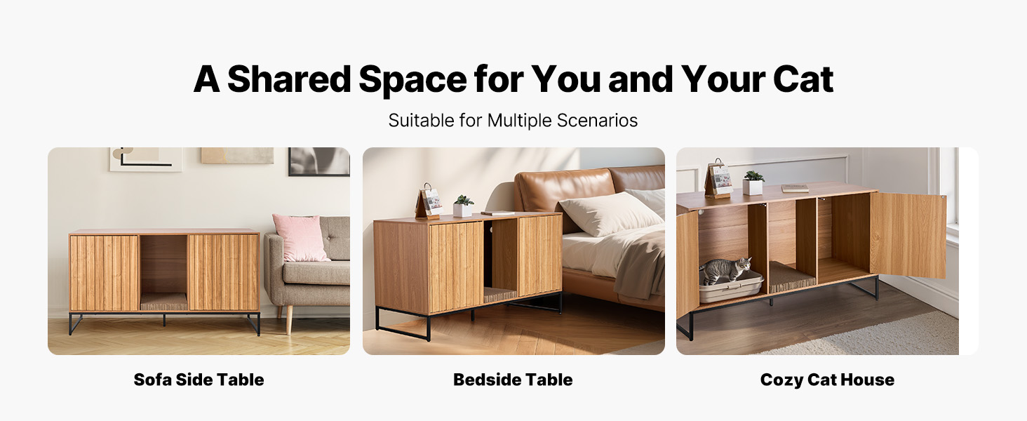 Náš skrytý nábytok pre mačky slúži ako skrinka na podstielku, nočný stolík, skrinka pri pohovke a domček pre mačky, všetko v jednom. Ľahko sa začlení do rôznych štýlov domácnosti, ako sú obývacie izby a spálne.