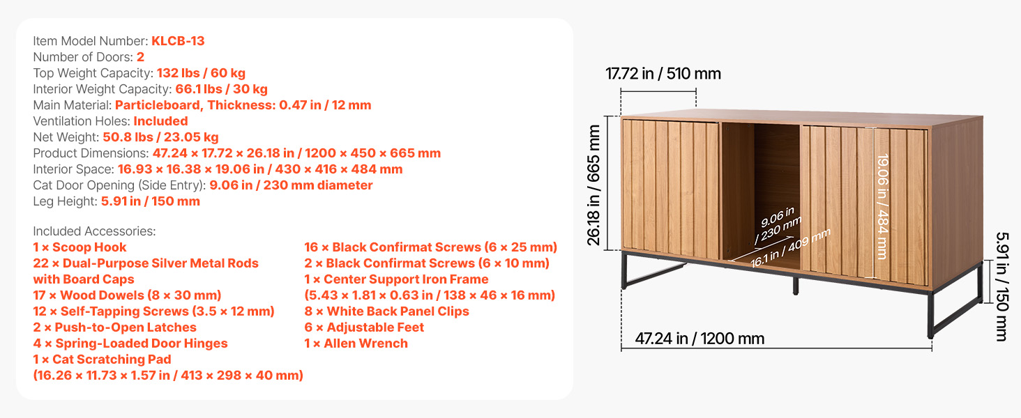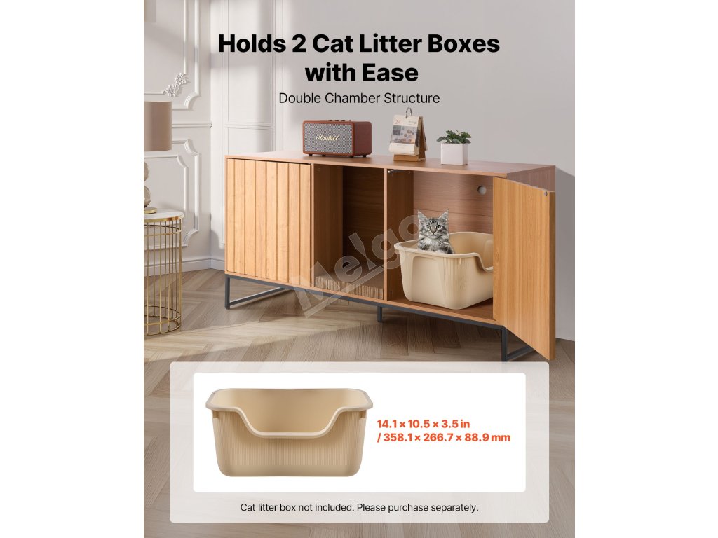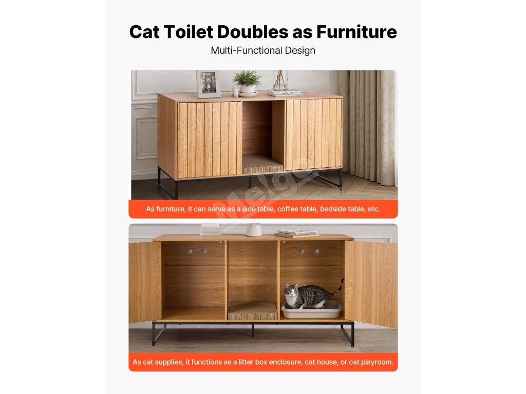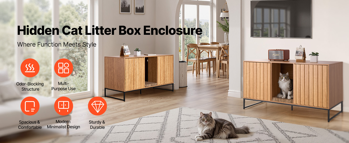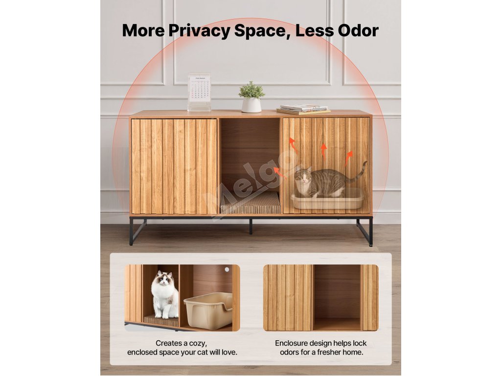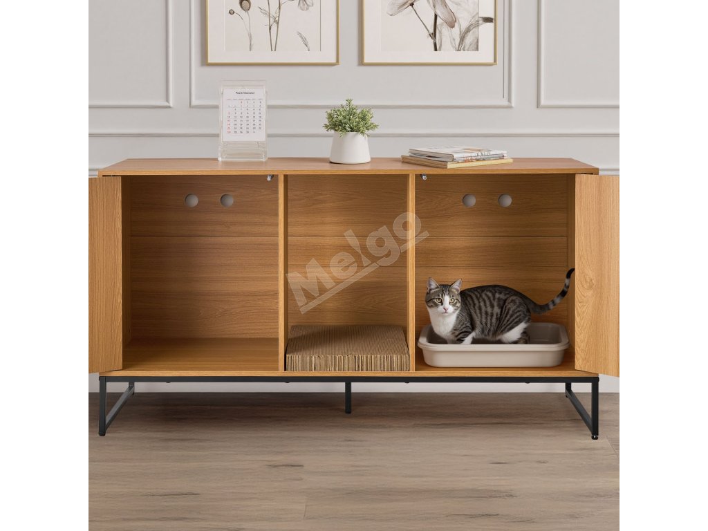 Táto skrytá skrinka na mačacie záchody sa flexibilne premení na bočnú skrinku v severskom štýle alebo skrinku na TV. Elegantne blokuje zápach a vysypané mačacie stelivo a zároveň udržiava váš domov čistý a štýlový.