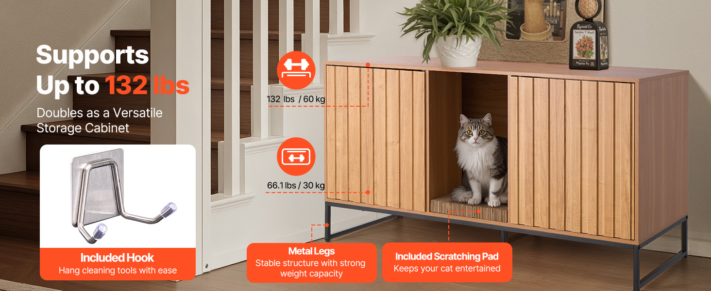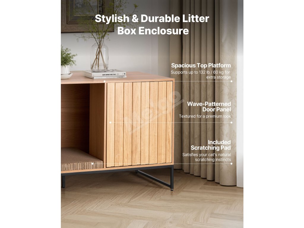 Horná plošina nášho nábytku s boxom na podstielku unesie až 132 kg, na ktorú možno ľahko umiestniť knihy, dekorácie a iné predmety. Dodáva podložku na škrabanie na zabavenie vašich mačiek a odoláva otrasom aj pri skokoch veľkých mačiek.