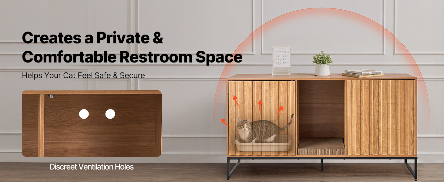 Nábytok do boxu na mačacie stelivo má uzavretú konštrukciu, ktorá v kombinácii so skrytými vetracími otvormi blokuje zápach a zároveň udržiava cirkuláciu vzduchu. Vytvára uzavretý a súkromný priestor na toaletu pre vaše mačky.