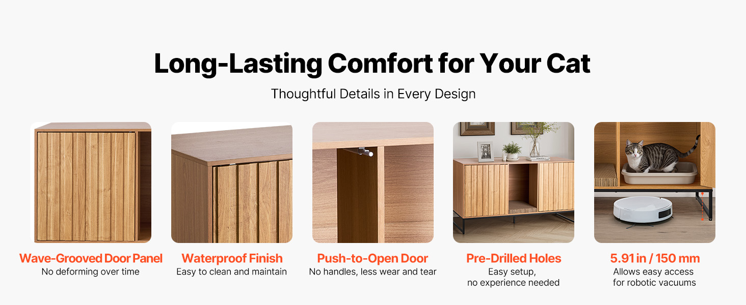 Táto drevená skrinka na podstielku je vybavená drážkovaným panelom dvierok odolným proti deformácii a ľahko čistiteľnou vodoodolnou povrchovou úpravou. Dodáva sa s hladkými a tichými dvierkami otváranými zatlačením a s predvŕtaným dizajnom, ktorý umožňuje jednoduchú inštaláciu aj začiatočníkom.