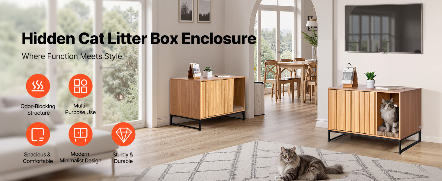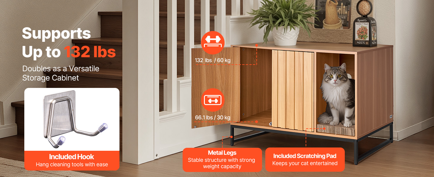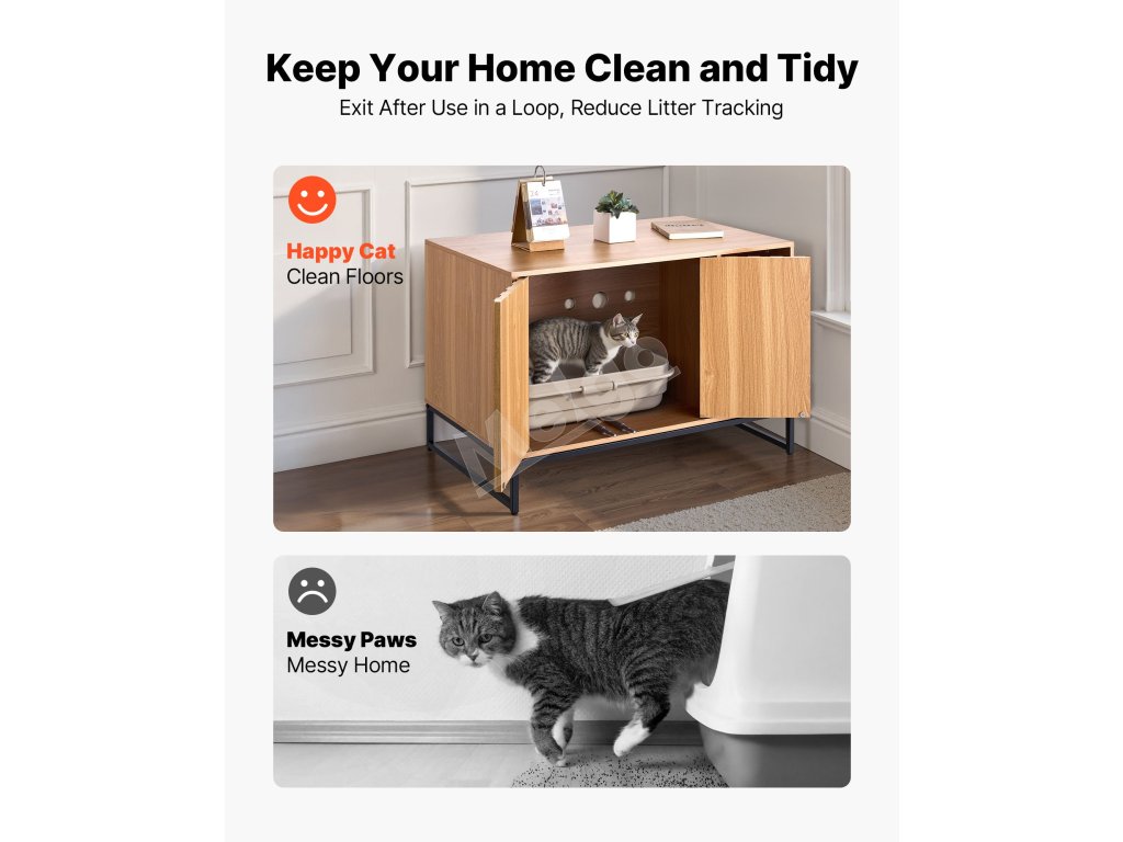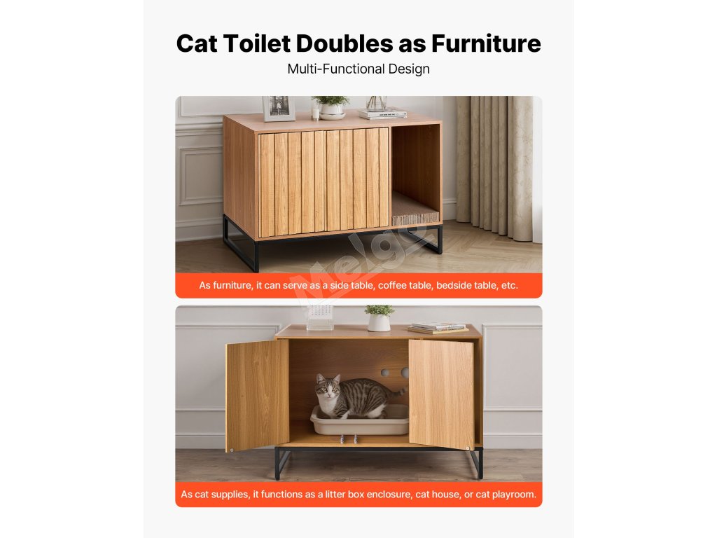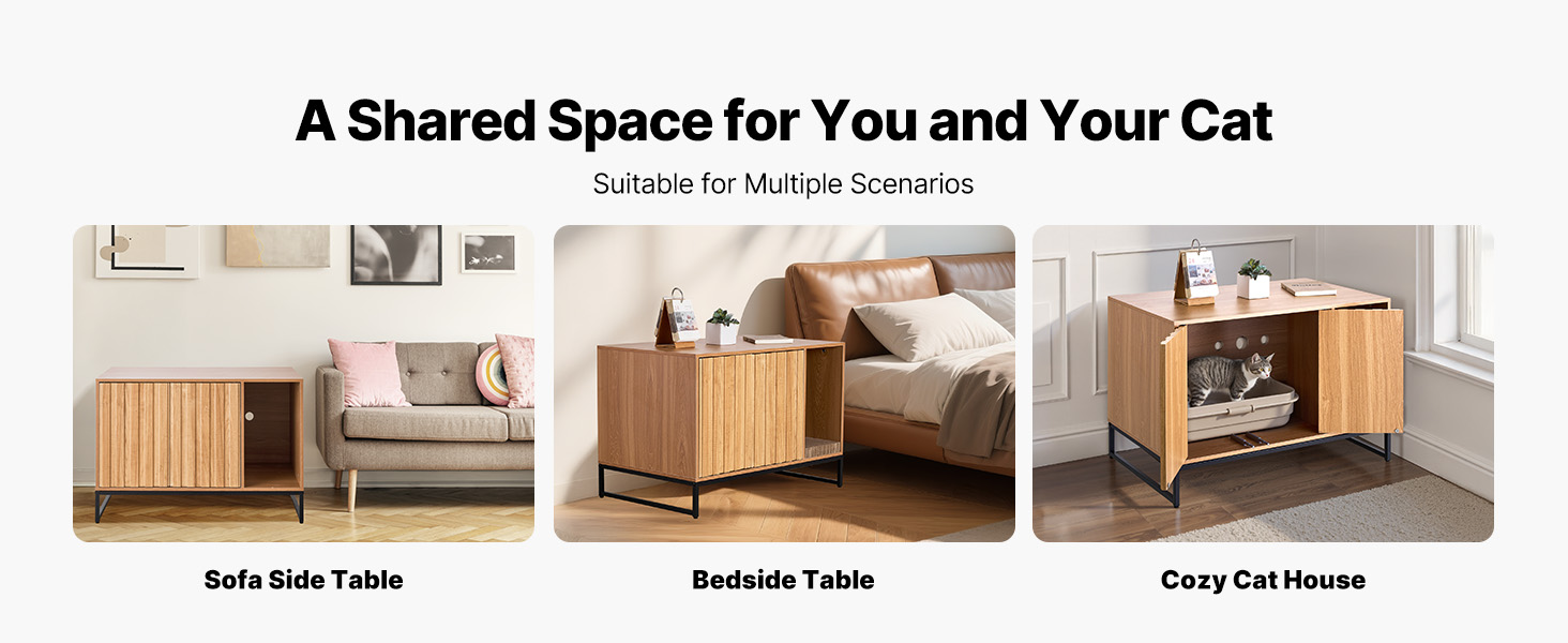 Náš skrytý nábytok pre mačky slúži ako skrinka na podstielku, nočný stolík, skrinka pri pohovke a domček pre mačky, všetko v jednom. Ľahko sa začlení do rôznych štýlov domácnosti, ako sú obývacie izby a spálne.