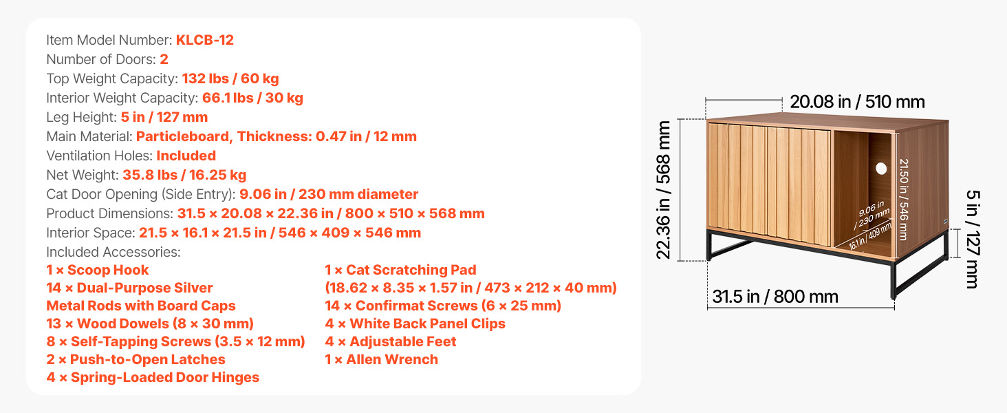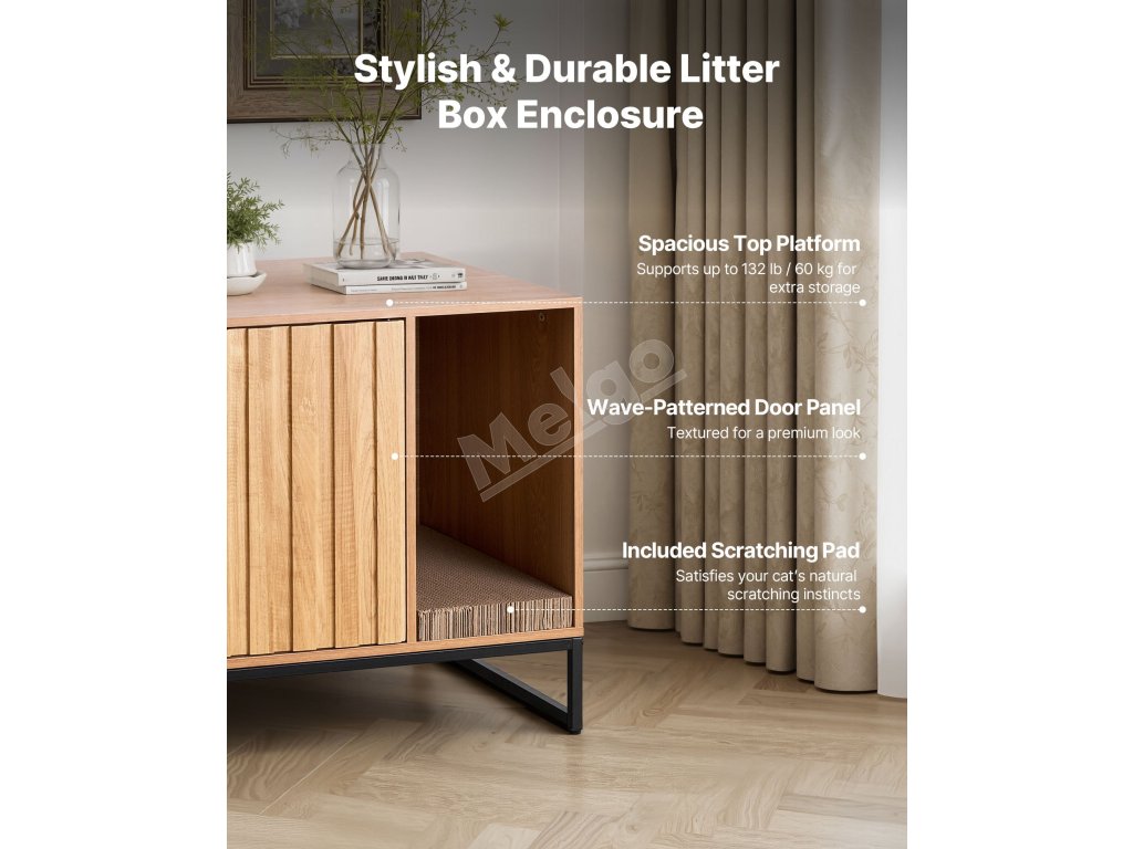 Táto skrytá skrinka na mačacie záchody sa flexibilne premení na bočnú skrinku v severskom štýle alebo skrinku na TV. Elegantne blokuje zápach a vysypané mačacie stelivo a zároveň udržiava váš domov čistý a štýlový.