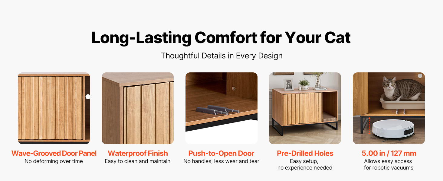 Táto drevená skrinka na podstielku je vybavená drážkovaným panelom dvierok odolným proti deformácii a ľahko čistiteľnou vodoodolnou povrchovou úpravou. Dodáva sa s hladkými a tichými dvierkami otváranými zatlačením a s predvŕtaným dizajnom, ktorý umožňuje jednoduchú inštaláciu aj začiatočníkom.