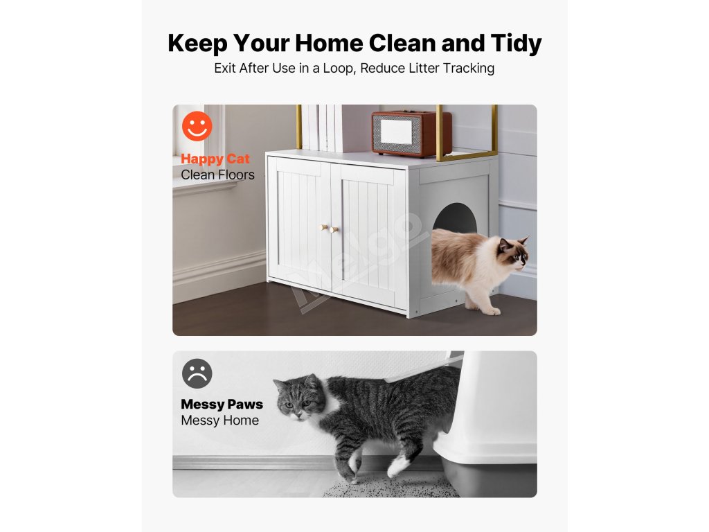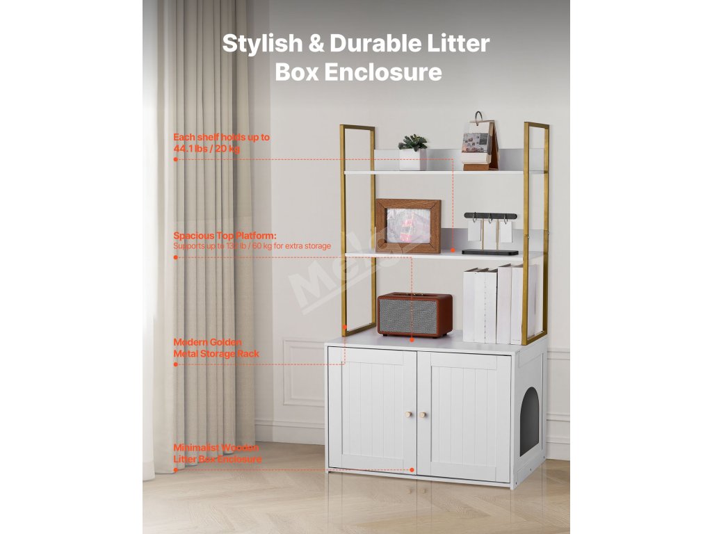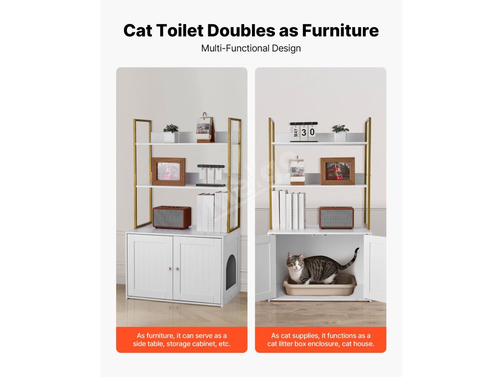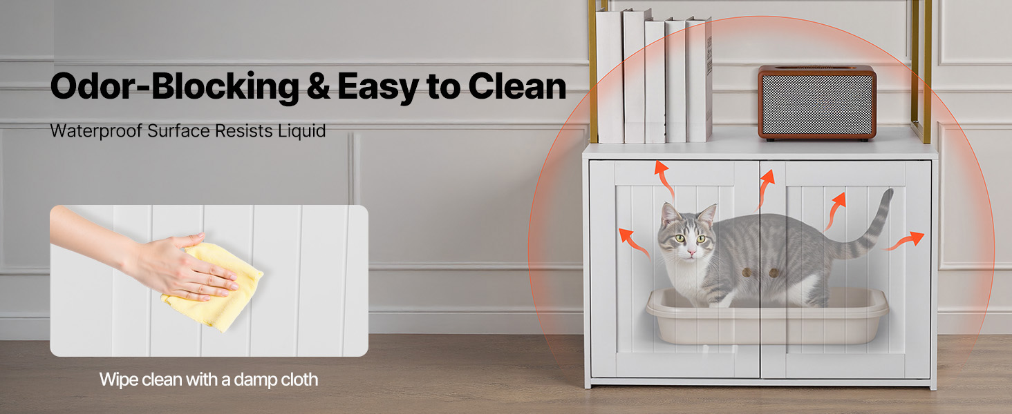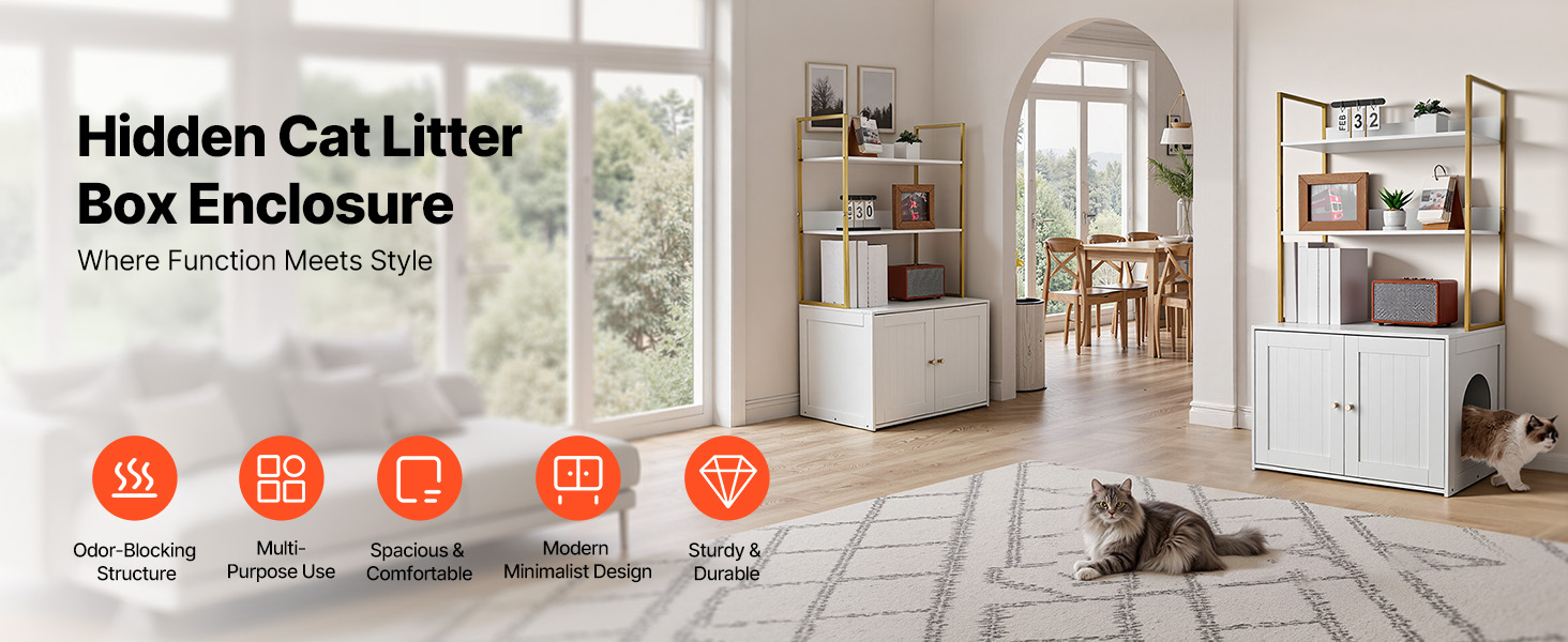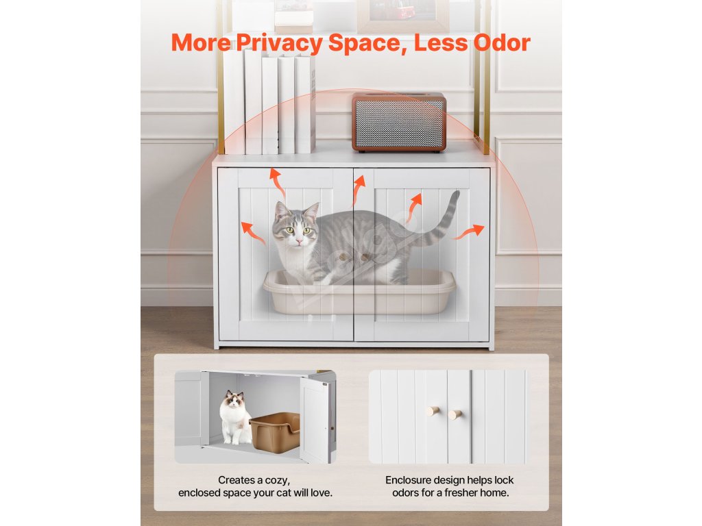 Táto skrytá skrinka na mačacie záchody sa flexibilne premení na bočnú skrinku v severskom štýle alebo skrinku na TV. Elegantne blokuje zápach a vysypané mačacie stelivo a zároveň udržiava váš domov čistý a štýlový.