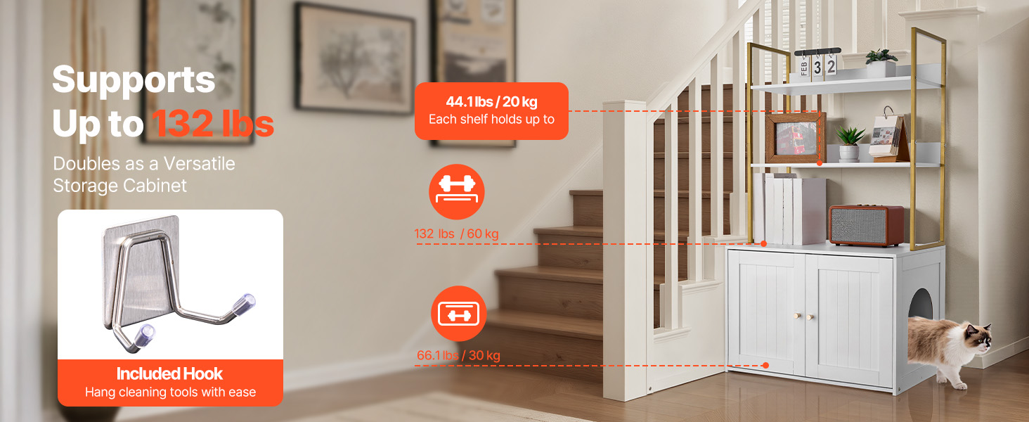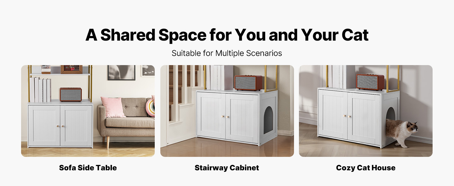 Náš skrytý nábytok pre mačky slúži ako skrinka na podstielku, skrinka na schody, bočná skrinka na pohovku a domček pre mačky, všetko v jednom. Ľahko sa začlení do rôznych štýlov domácnosti, ako sú obývacie izby a vchodové schodisko.