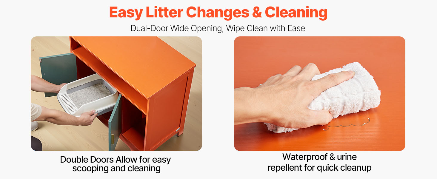 Dvojité predné dvierka sa otvárajú doširoka pre ľahký prístup pri výmene podstielky. Vodoodolné povrchy odolné voči moču sa rýchlo utierajú, čo šetrí čas a námahu.