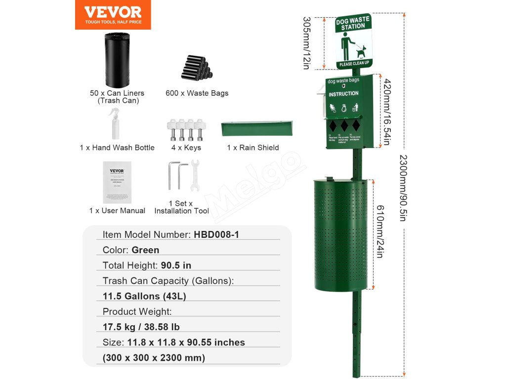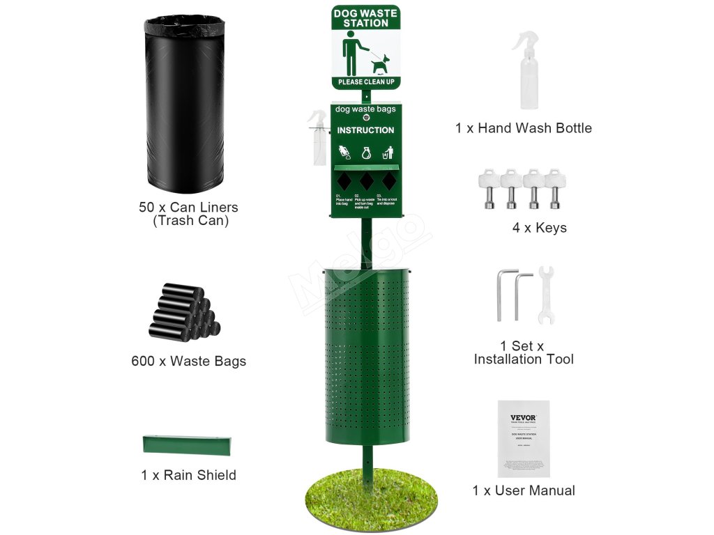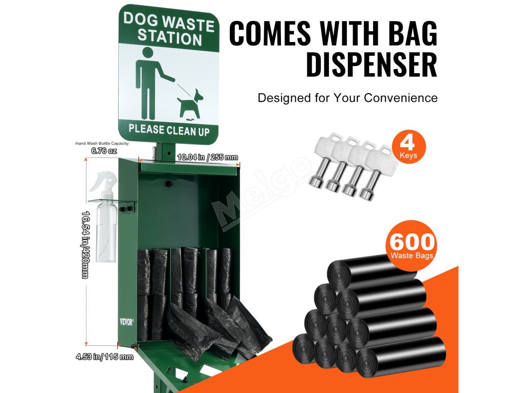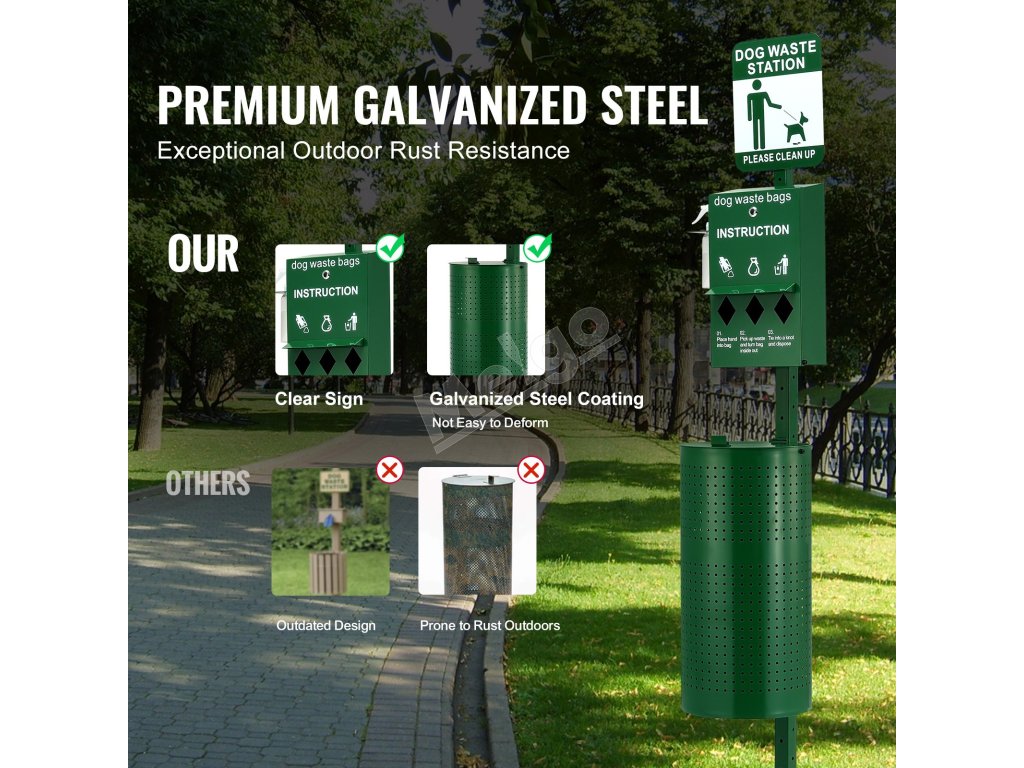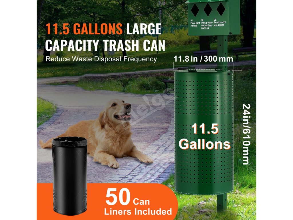 Táto 11,5-galónová zelená stanica na psie exkrementy sa dodáva so 600 zbernými vreckami a 50 vreckami na odpadky, vyrobená z odolnej pozinkovanej ocele. Je ideálna na miesta vhodné pre domácich miláčikov, ako sú parky, dvory, obytné oblasti a kadernícke salóny!
