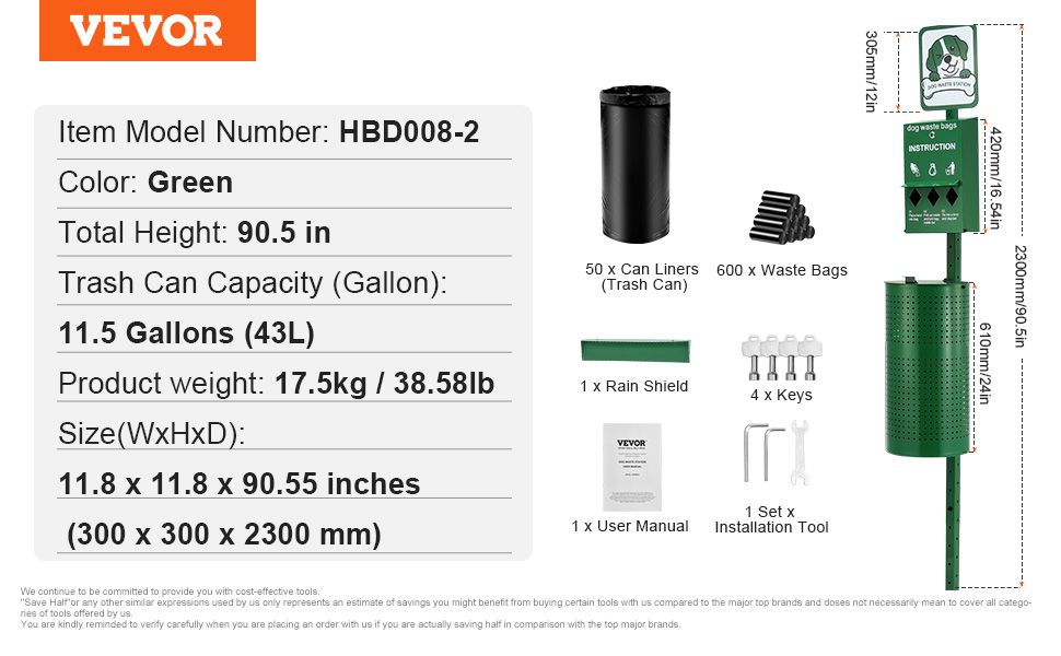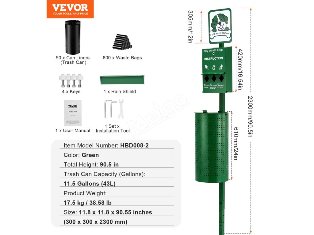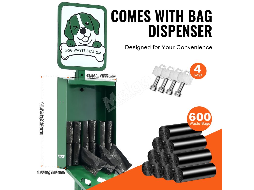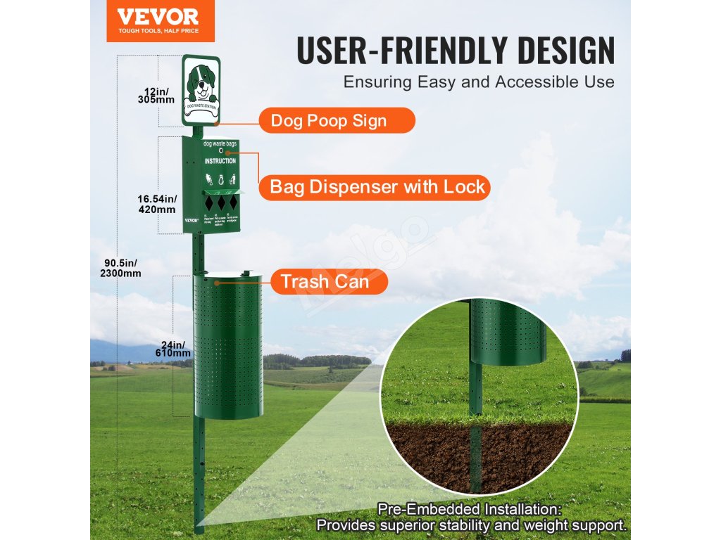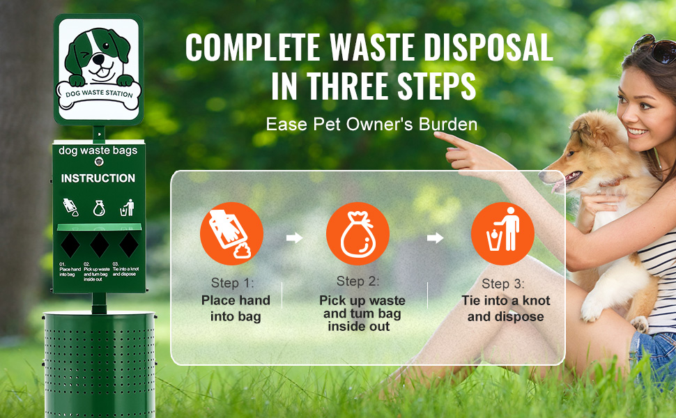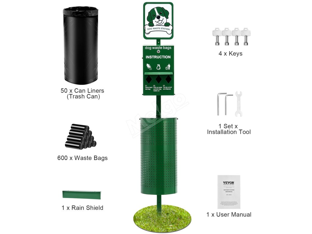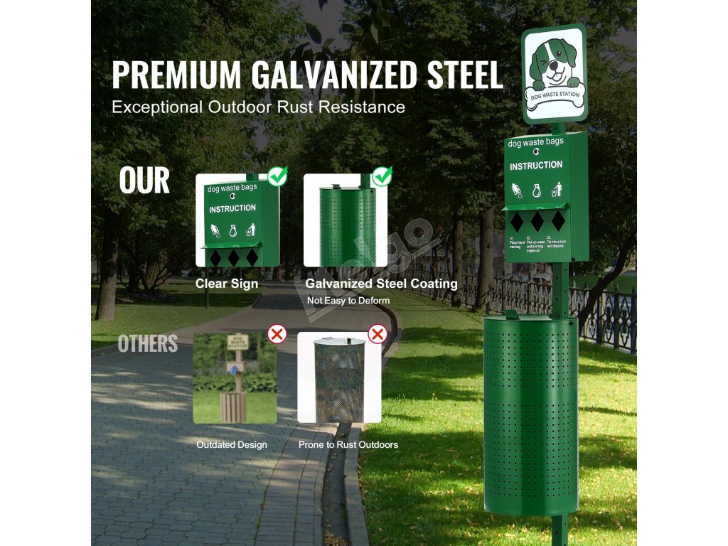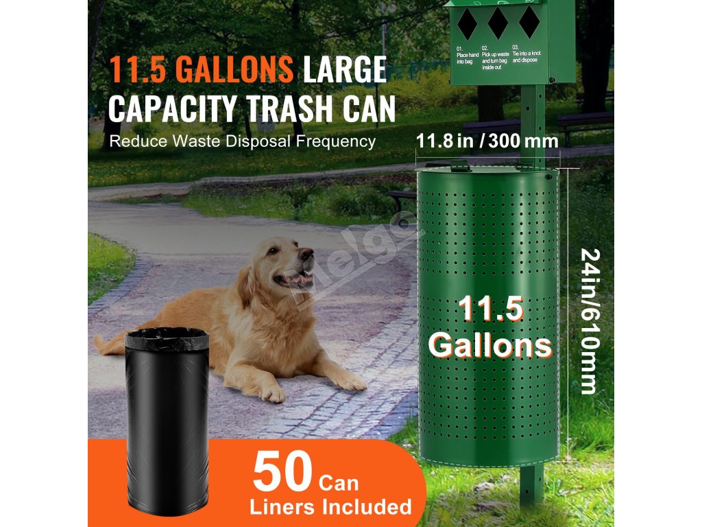Táto 11,5-galónová zelená stanica na psie exkrementy sa dodáva so 600 zbernými vreckami a 50 vreckami na odpadky, vyrobená z odolnej pozinkovanej ocele. Je ideálna pre miesta vhodné pre domácich miláčikov, ako sú parky, dvory, obytné oblasti a kadernícke salóny!