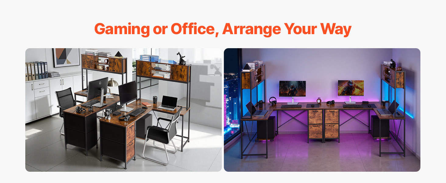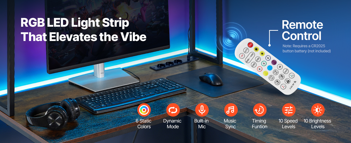 Vylepšite svoj herný alebo pracovný zážitok s týmto herným stolom VEVOR v tvare L, ktorý sa vyznačuje reverzibilným dizajnom s 4 možnosťami montáže, farebným RGB svetelným pásikom, vstavanou zásuvkou a priestranným úložným priestorom, aby bola vaša zostava organizovaná a efektívna.