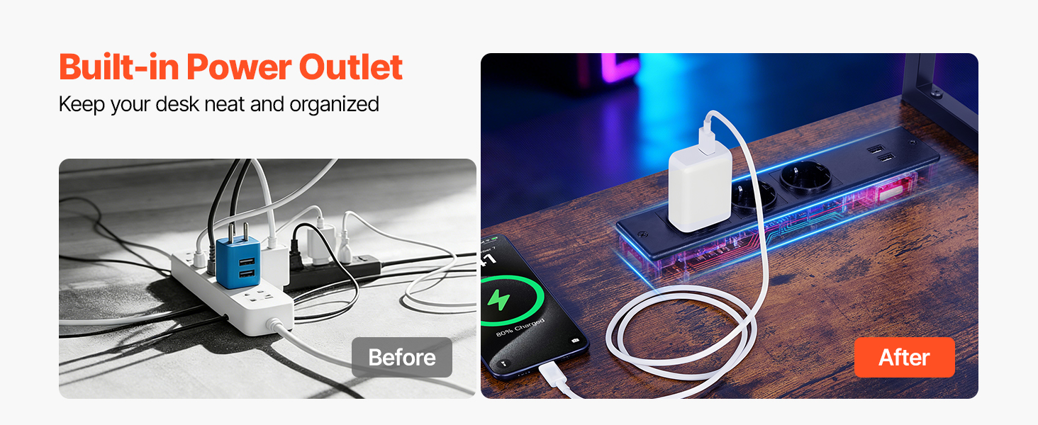 Nabíjajte zariadenia priamo na stole pomocou vstavanej elektrickej zásuvky, vďaka čomu budete mať káble usporiadané a pracovný priestor uprataný.
