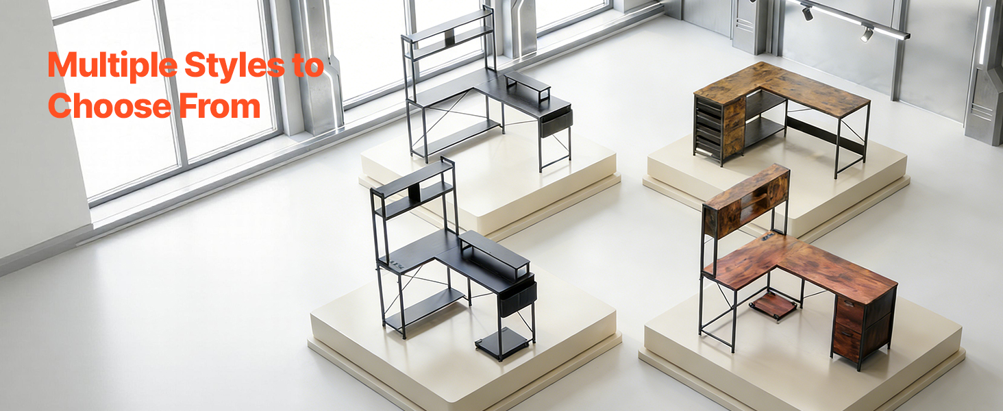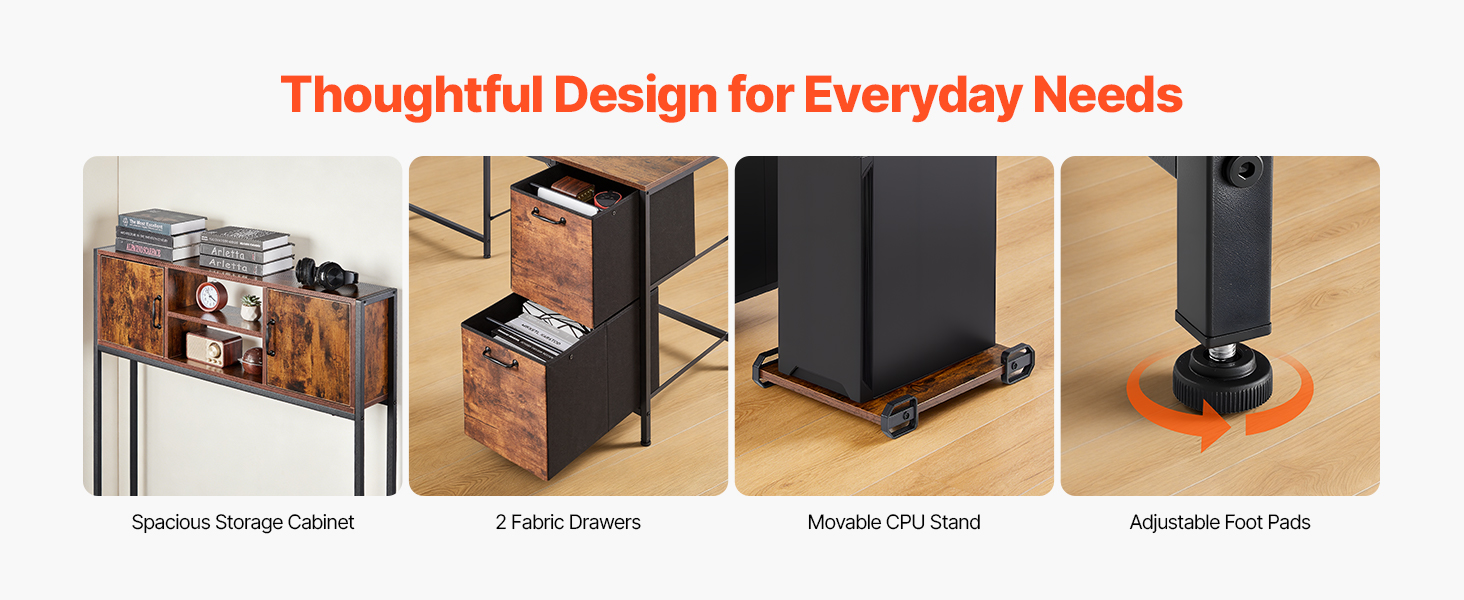 Dve skrine a látkové zásuvky poskytujú flexibilný úložný priestor, vďaka ktorému budete mať potrebné veci usporiadané a po ruke, zatiaľ čo pohyblivý stojan na CPU udrží vašu počítačovú vežu nad podlahou a pohodlne dostupnú.