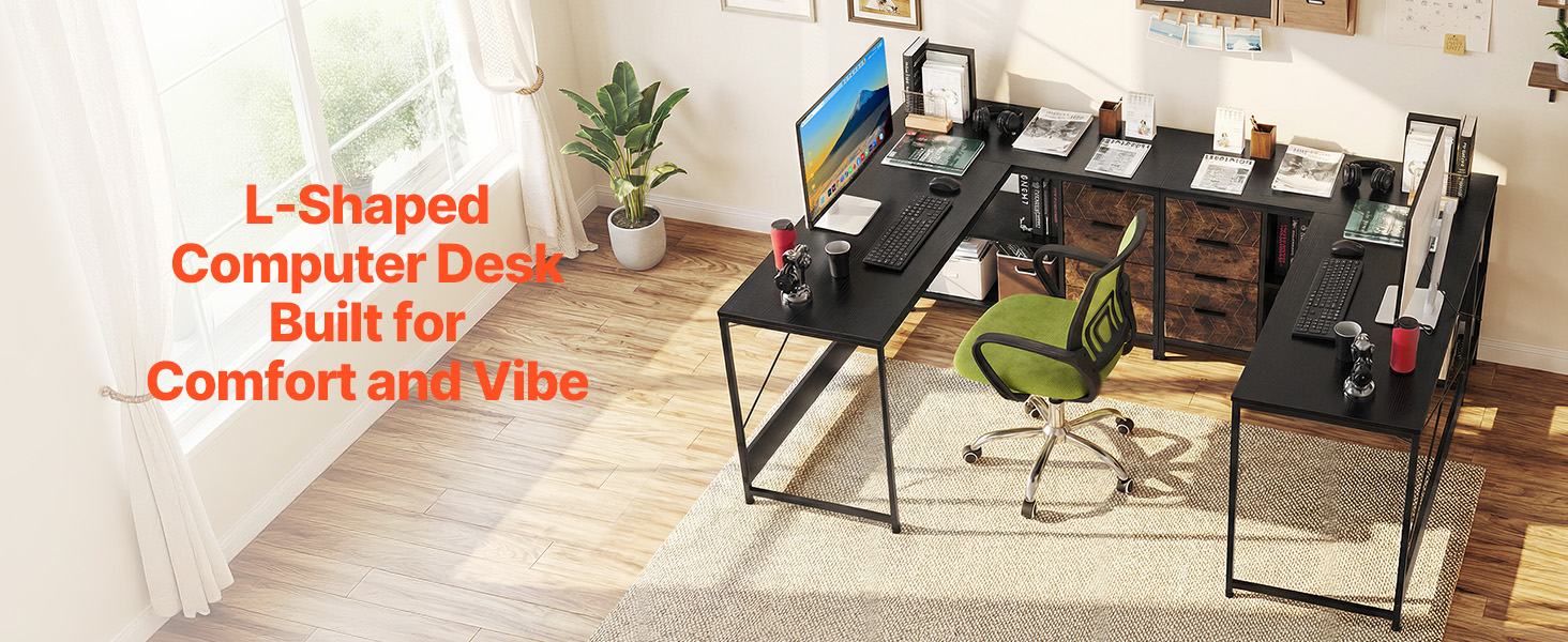 Tento počítačový stôl v tvare L kombinuje moderný štýl s praktickým úložným priestorom a pevnou konštrukciou a vylepšuje váš pracovný priestor o pohodlie a efektivitu. Je vybavený štyrmi drevenými zásuvkami a dvojitou spodnou policou, čo je ideálne na prácu, štúdium alebo hranie hier.