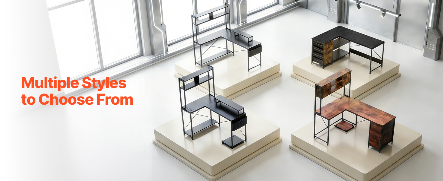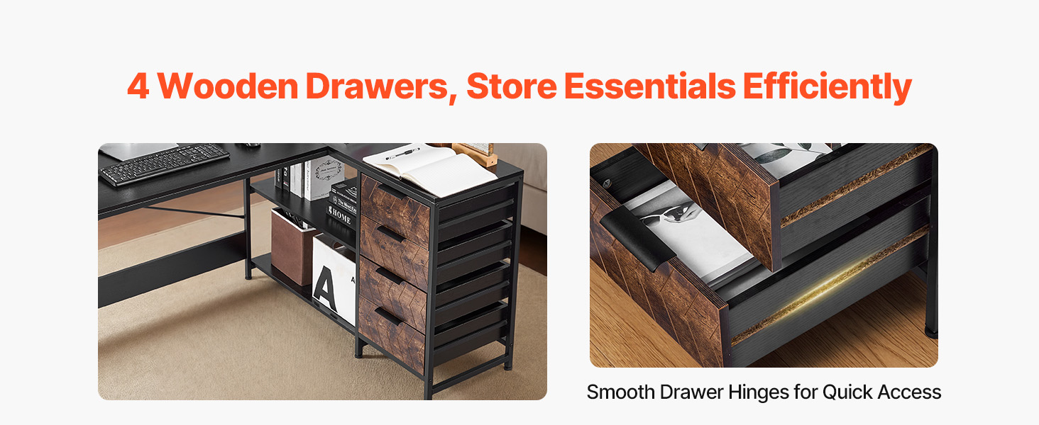 Náš domáci kancelársky stôl v tvare L má 4 hladko kĺzavé drevené zásuvky, ktoré poskytujú ľahký prístup a univerzálny úložný priestor na dokumenty, kancelárske potreby a osobné veci.