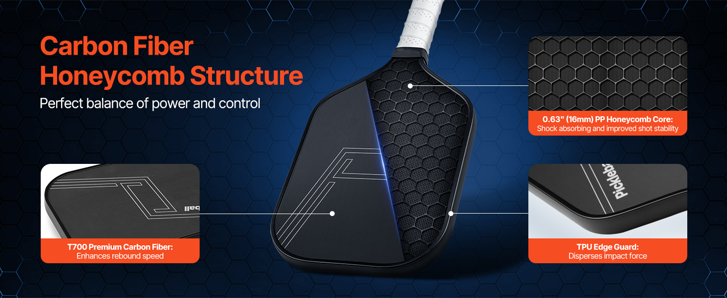 Povrch pádla je vyrobený z vysokokvalitných uhlíkových vlákien T700, ktoré zvyšujú rýchlosť odrazu loptičky. Voštinové jadro z PP poskytuje tlmenie nárazov a znižuje vibrácie, čím zabezpečuje stabilné údery. Chránič hrán z TPU rozptyľuje nárazy a chráni hrany pádla.