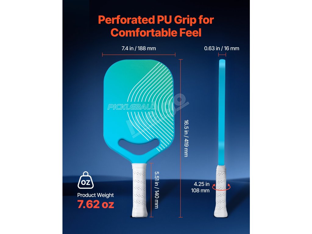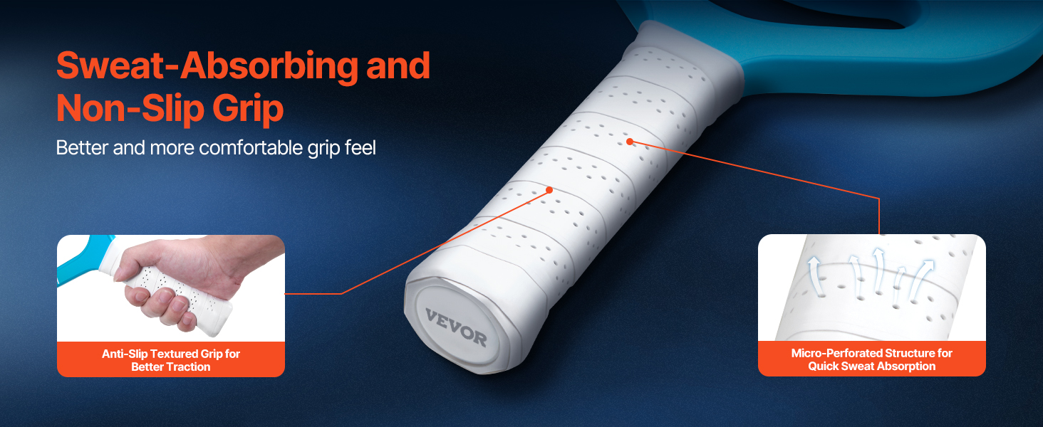 Piklebalová raketa je vybavená pot pohlcujúcou a odpruženou rukoväťou, ktorá zabezpečuje stabilné držanie a dlhotrvajúci komfort počas hry. Rukoväť je dokonale dimenzovaná tak, aby poskytovala maximálne pohodlie a kontrolu aj počas dlhších sedení.