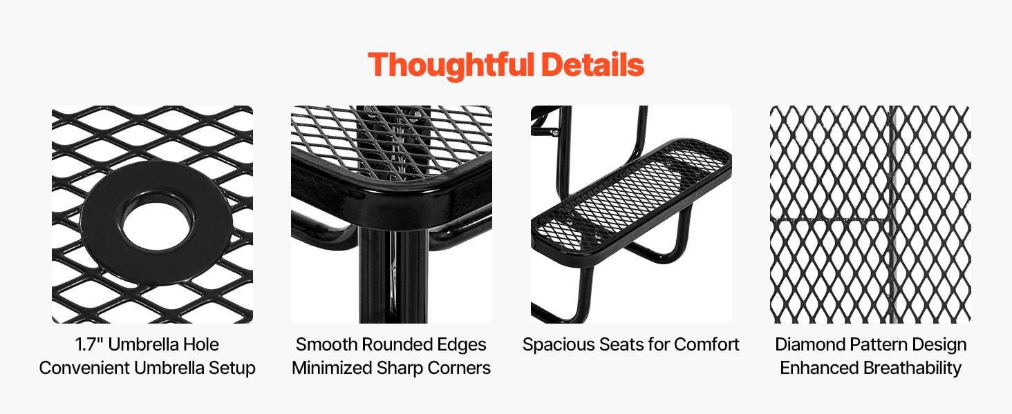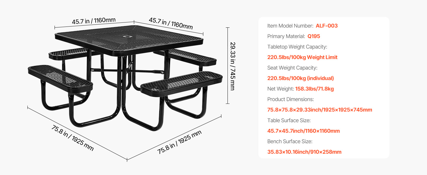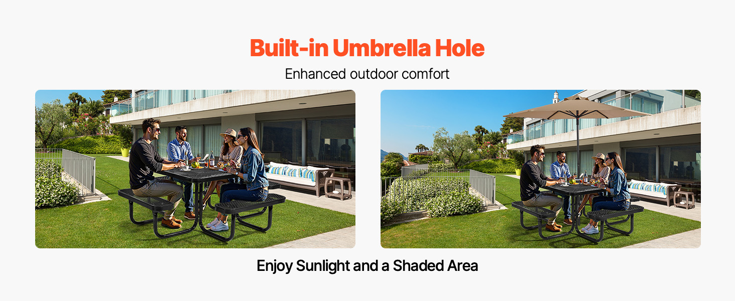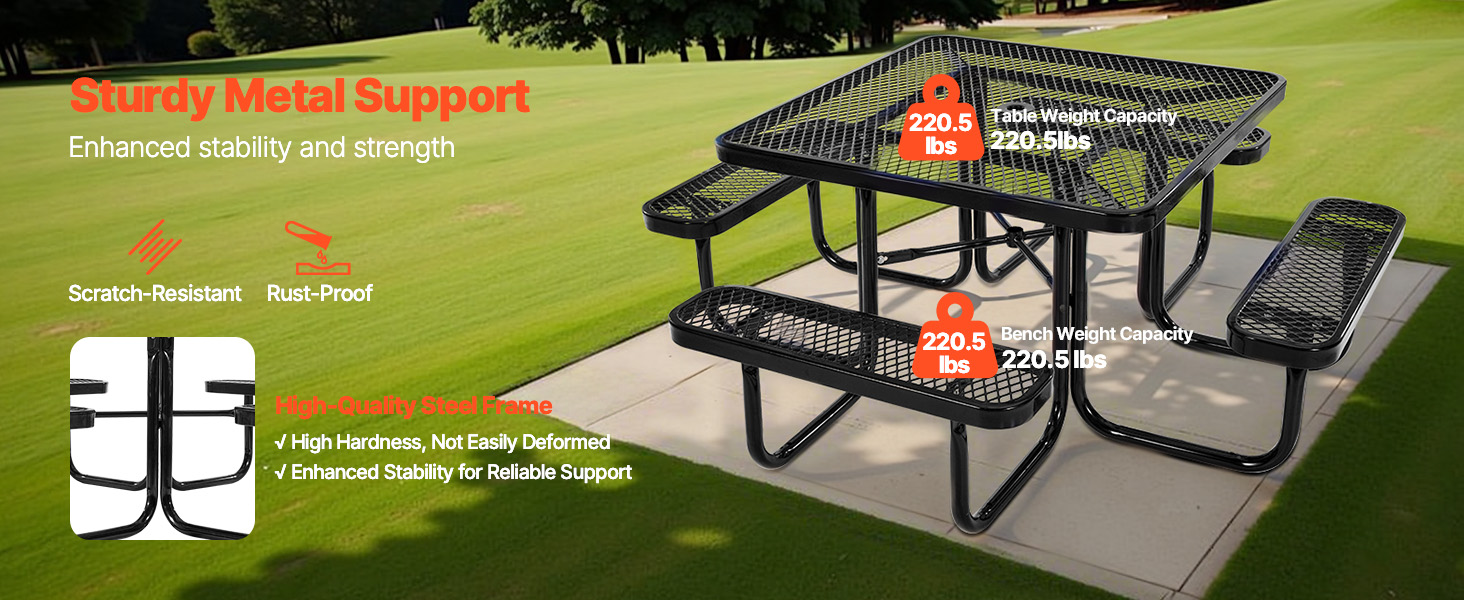 Tento vonkajší piknikový stôl, vyrobený z robustného kovového rámu známeho svojou výnimočnou pevnosťou a stabilitou, poskytuje spoľahlivú oporu a dlhodobú odolnosť, takže je ideálny na dlhodobé používanie vonku.