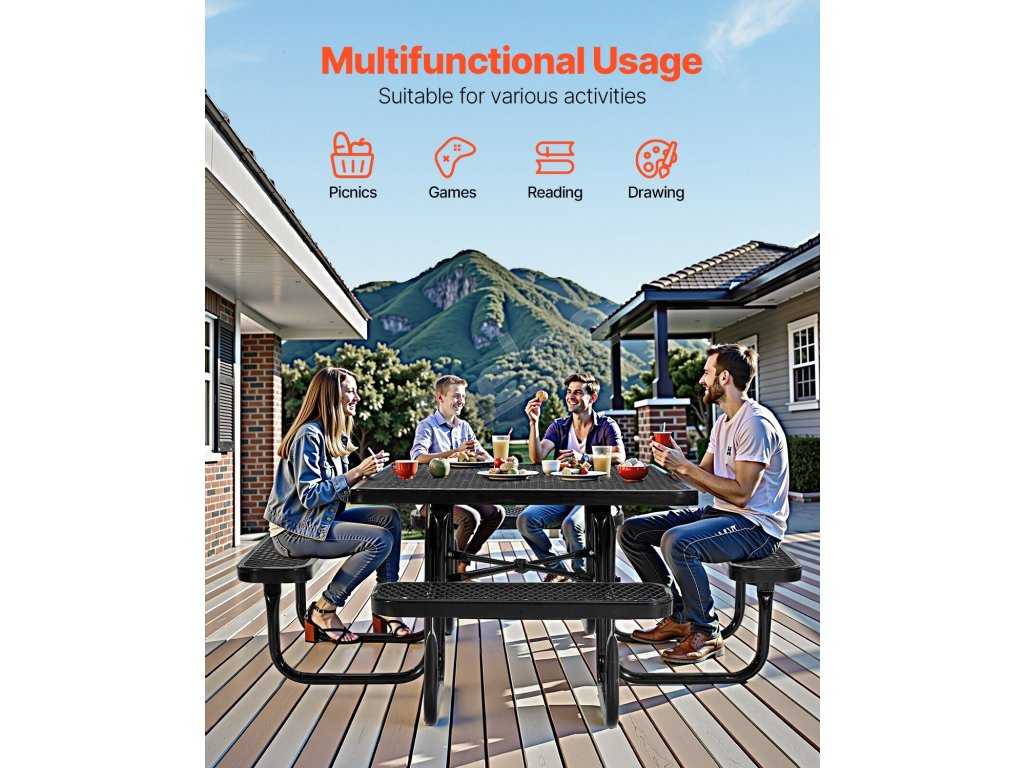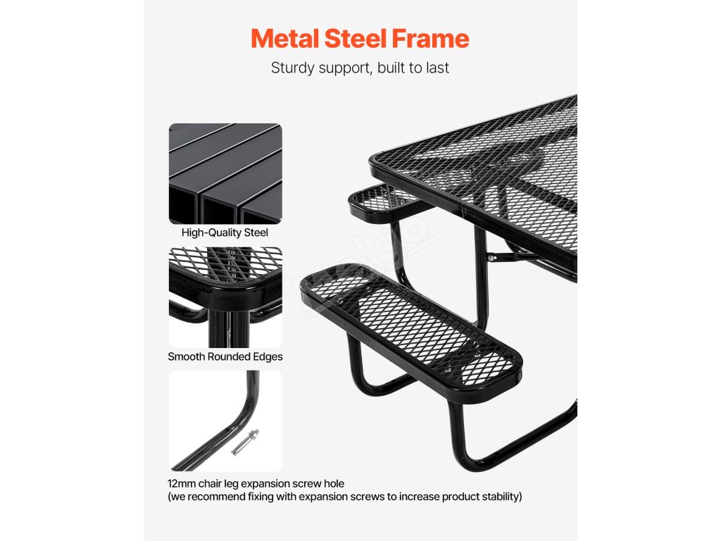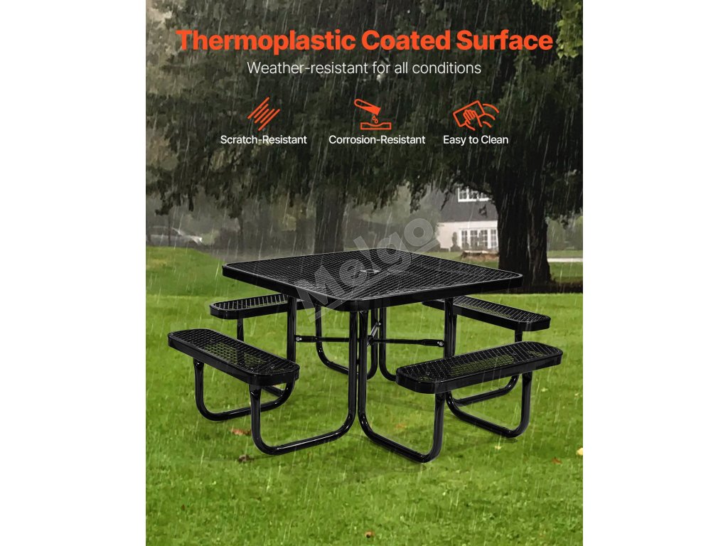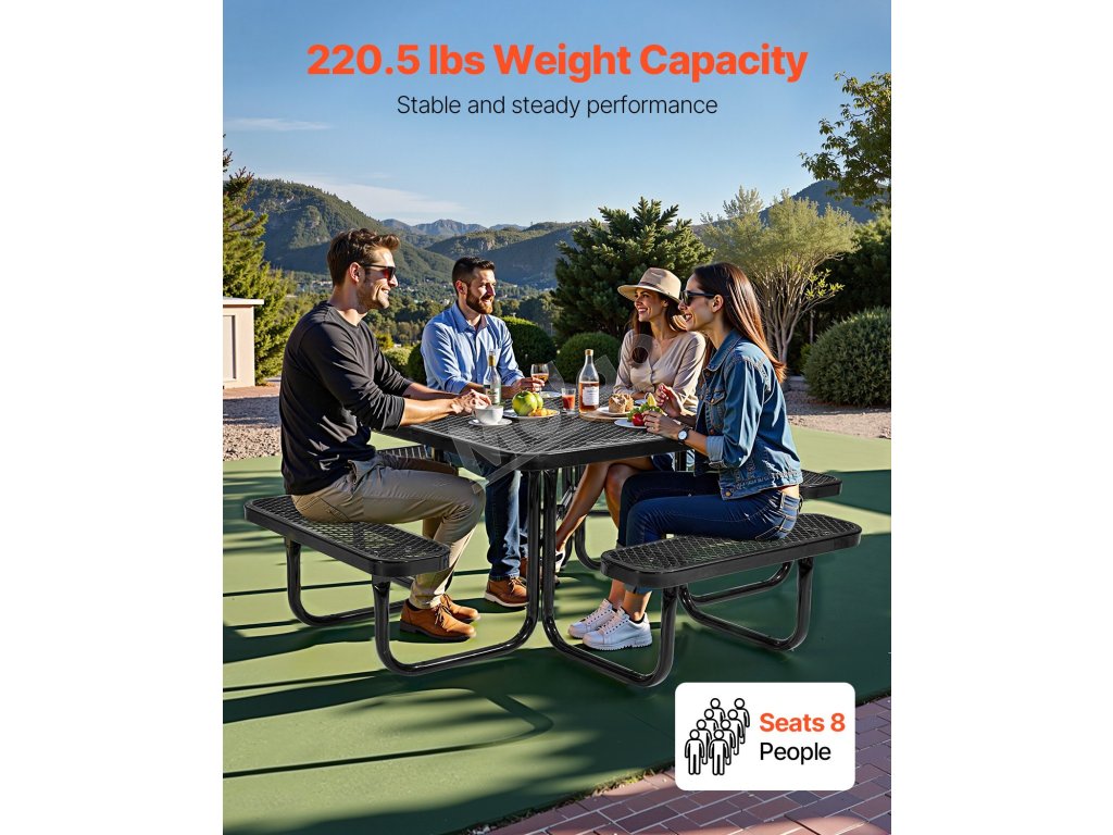 Tento vonkajší piknikový stôl, vyrobený z robustného kovového rámu známeho svojou výnimočnou pevnosťou a stabilitou, poskytuje spoľahlivú oporu a dlhodobú odolnosť, takže je ideálny na dlhodobé používanie vonku.