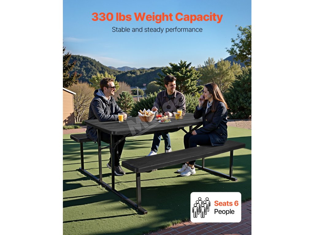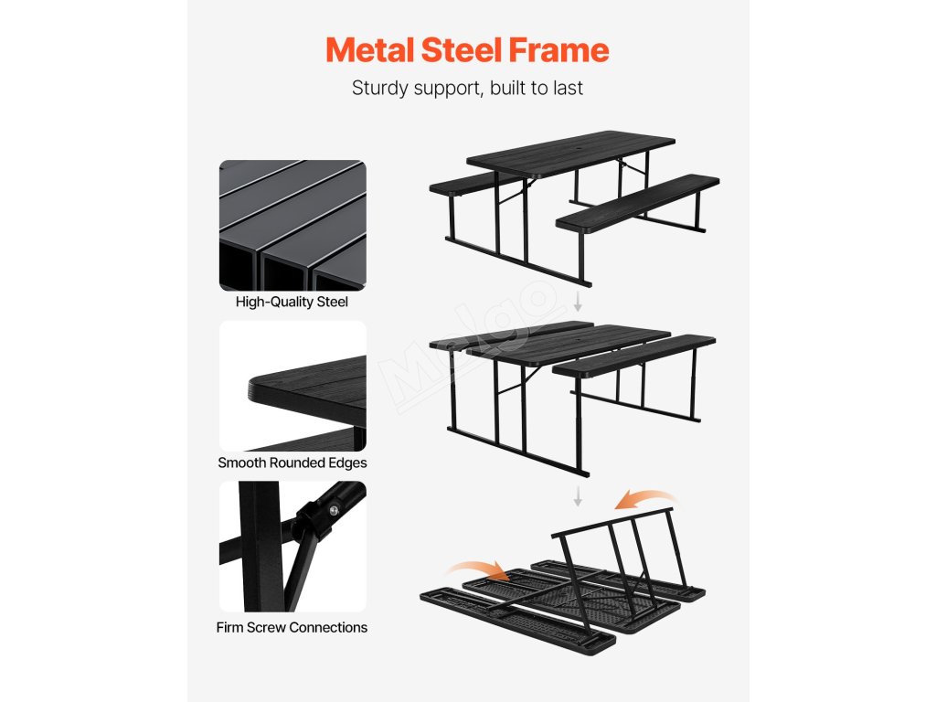 Tento vonkajší piknikový stôl, vyrobený z robustného kovového rámu známeho svojou výnimočnou pevnosťou a stabilitou, poskytuje spoľahlivú oporu a dlhodobú odolnosť, takže je ideálny na dlhodobé používanie vonku.