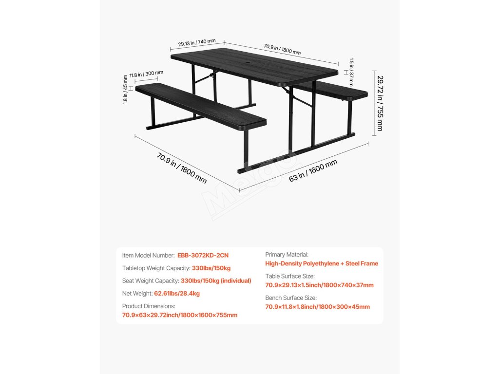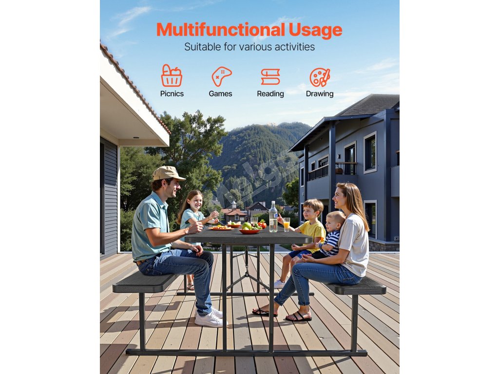 Táto súprava stola a lavice sa prispôsobí rôznym prostrediam a príležitostiam, či už poskytuje pohodlný priestor na stolovanie vo vonkajších reštauráciách, slúži ako miesto na rodinné aktivity v parkoch, alebo funguje ako hracia plocha v domácich záhradách a rekreačných zariadeniach.