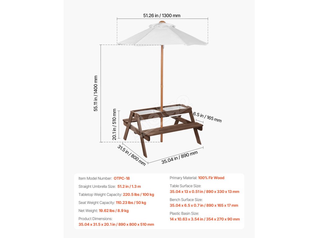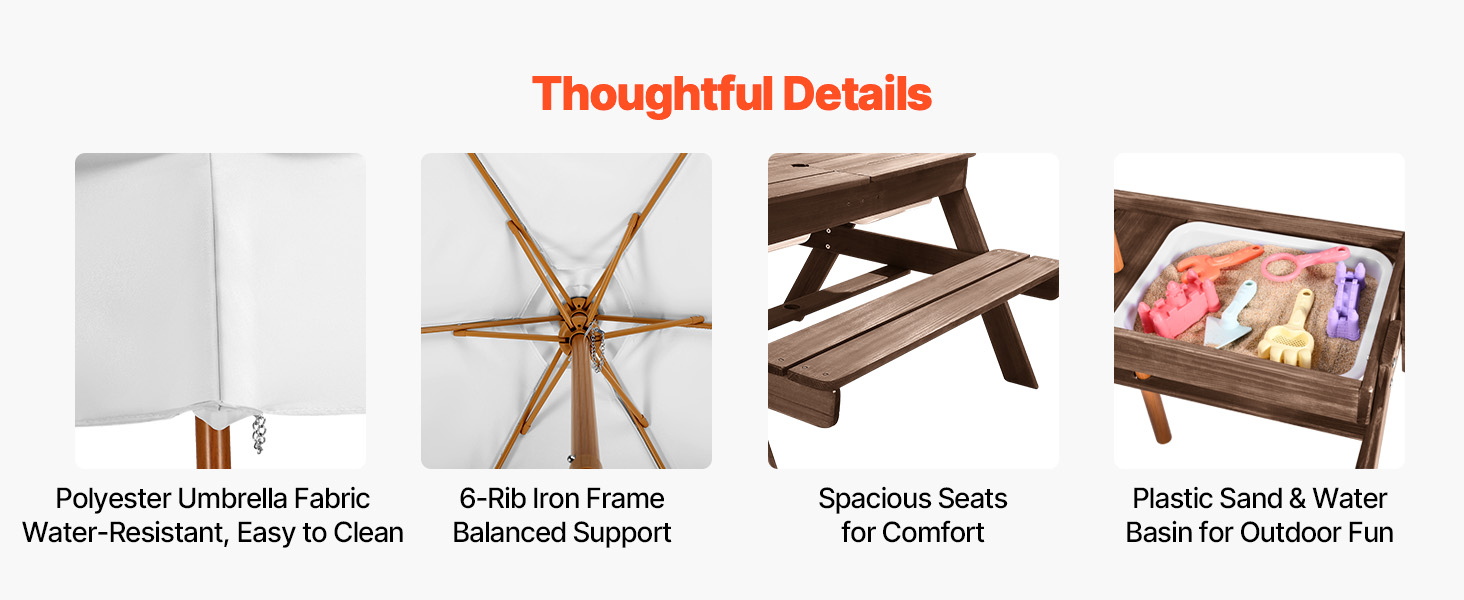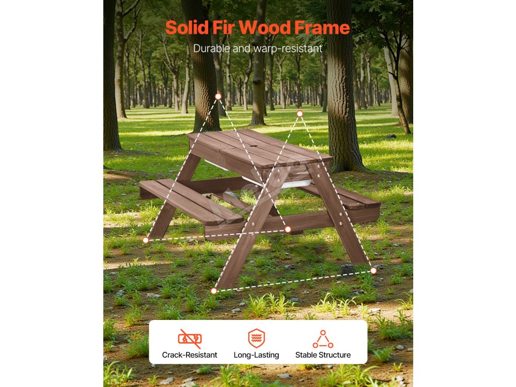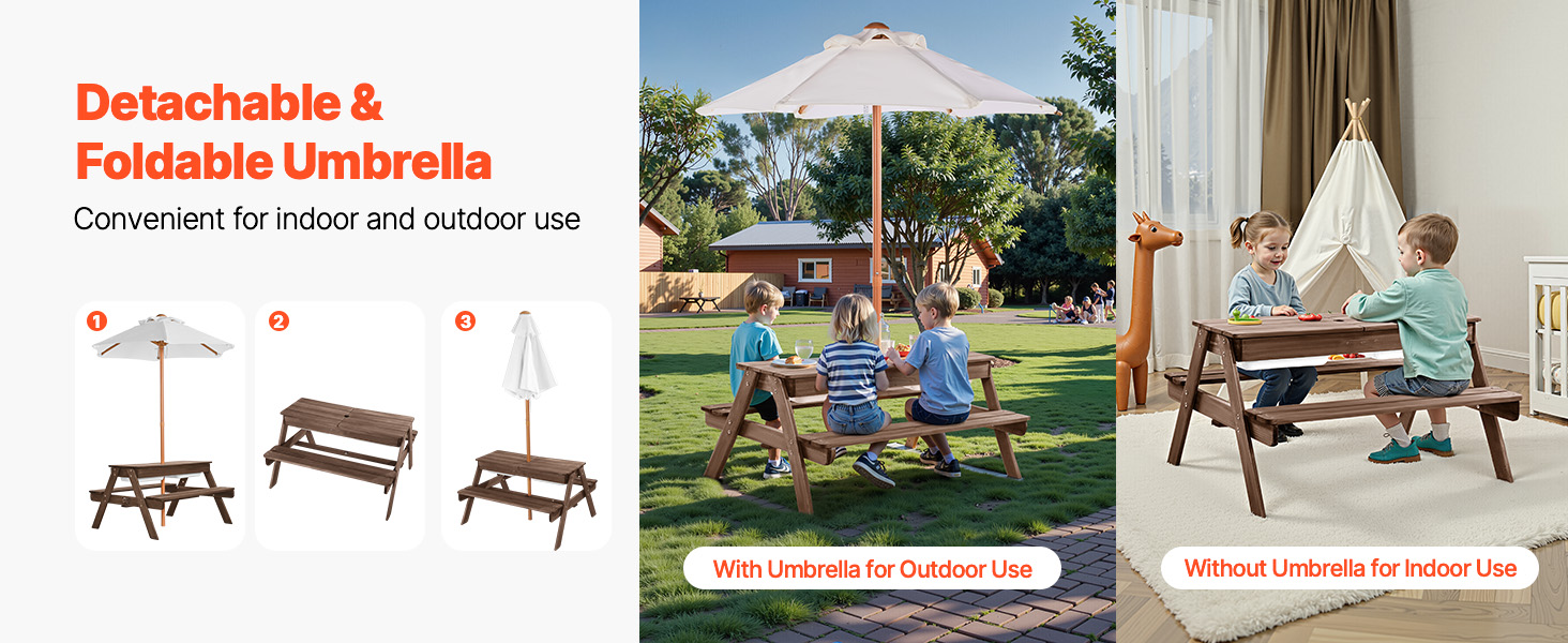 Detský piknikový stôl s dáždnikom, 3v1 piesok/voda, 4-osobný set