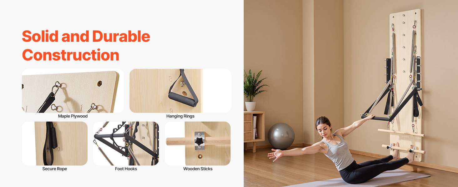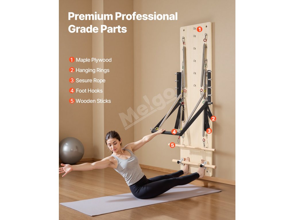 Zariadenie na pilates je vybavené prírodným, odolným drevom s pevnou konštrukciou, ktoré spĺňa každodenné tréningové potreby. Využíva biele masívne drevo pre estetickejší dizajn.