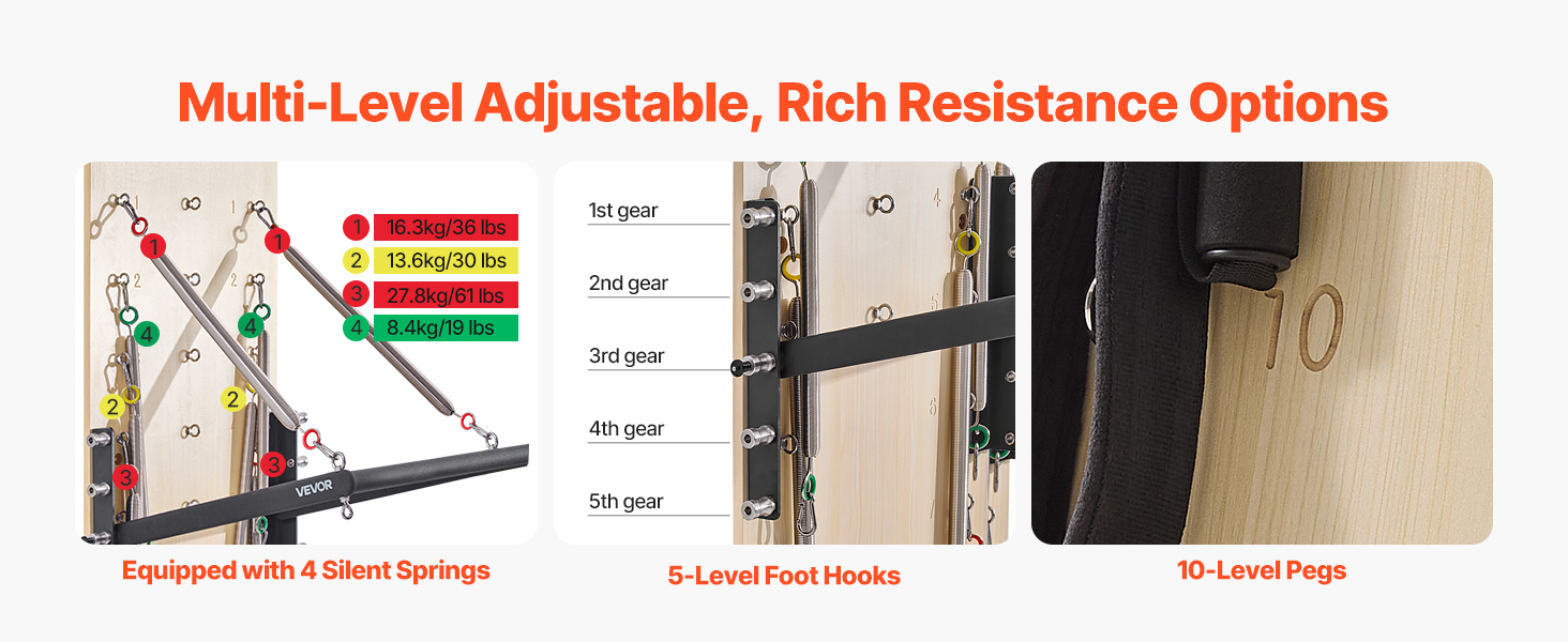Trenažér na cvičenie jogy využíva vysokokvalitné pružiny s 8 nastaviteľnými úrovňami odporu vrátane kombinácie ťažkých, stredných a ľahkých pružín. Je tiež vybavený 5 nastaviteľnými hákmi na nohy a 10 nastaviteľnými kolíkmi na doske, čo umožňuje prispôsobenie tréningu.