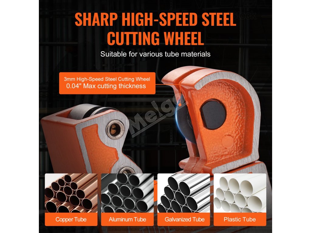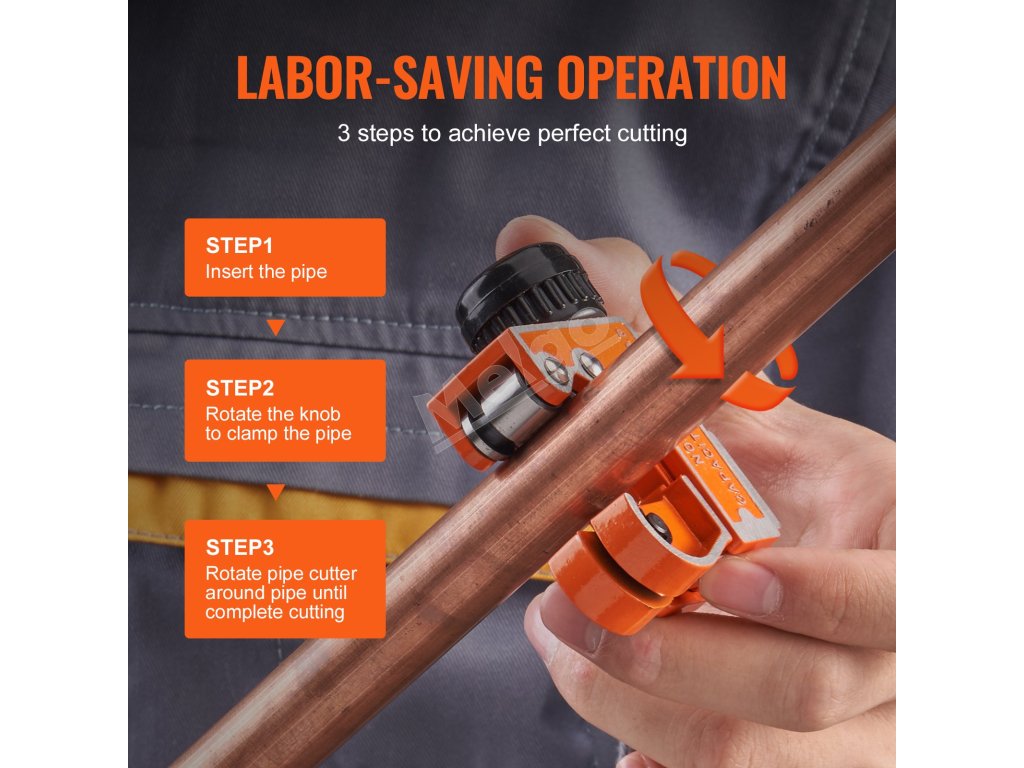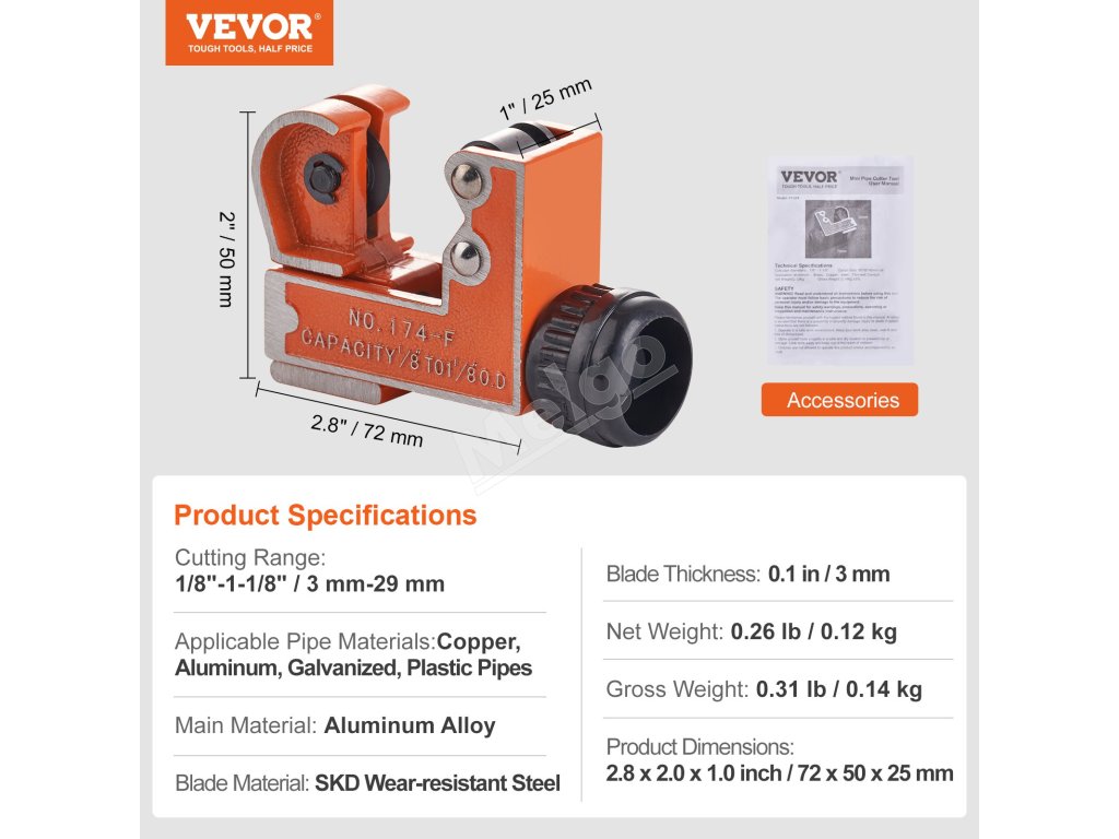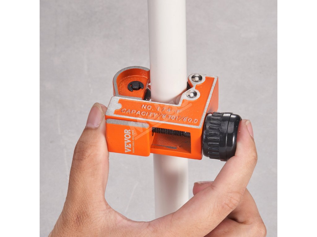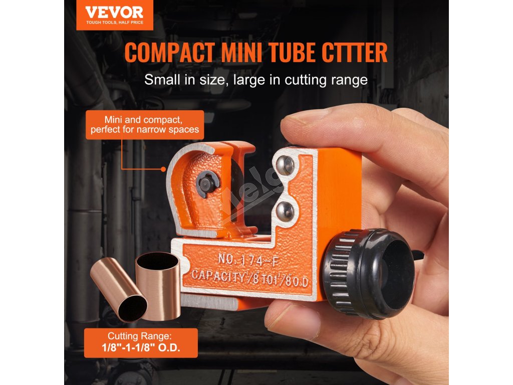 Mini rezačka rúrok VEVOR je schopná rezať rúrky s vonkajším priemerom 1/8" až 1-1/8". Napriek svojej kompaktnej veľkosti je vhodná na rezanie rúrok rôznych veľkostí a je praktická v stiesnených priestoroch a pri rúrkach s malým priemerom. Nezastupiteľné a kompaktné riešenie na rezanie rúrok pre amatérskych nadšencov DIY a profesionálov.