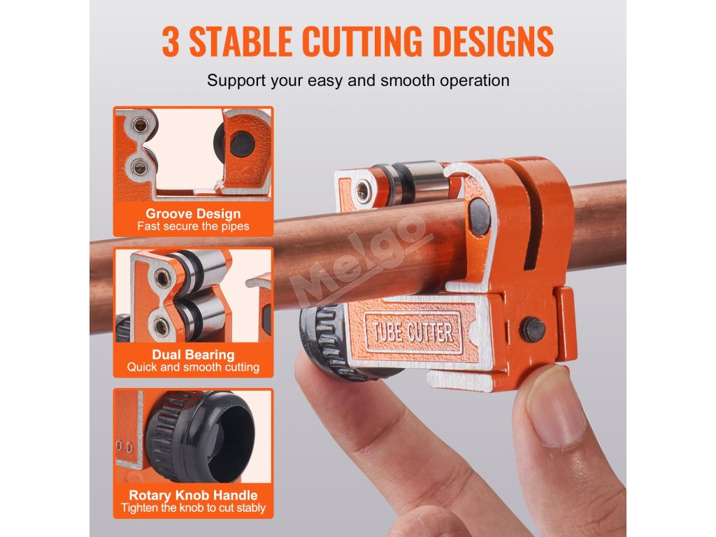 3 užívateľsky prívetivé konštrukcie zaisťujú stabilitu, hladšie rezanie a čistejšie rezy. Drážkovaná konštrukcia pomáha zaistiť rúrku na mieste, zatiaľ čo dvojité ložisko umožňuje rýchle a plynulé rezanie. Gombíková rukoväť poskytuje pohodlný úchop a po otočení zaisťuje stabilné rezanie.