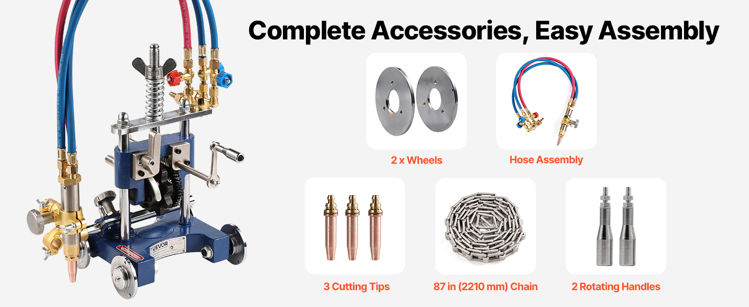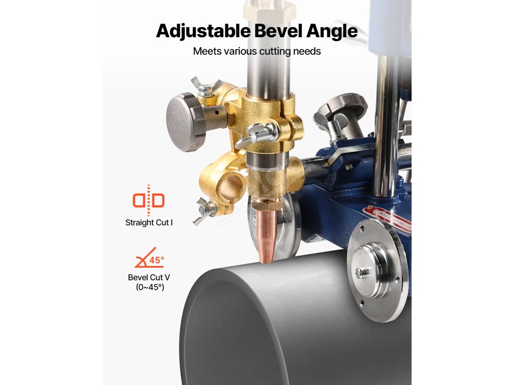 Stroj na skosenie rúr sa dodáva s 3 medenými reznými hrotmi, ktoré ponúkajú vynikajúcu tepelnú vodivosť a odolnosť voči vysokým teplotám, čím zabezpečujú jednoduché rezanie oceľových rúr, hliníkových zliatin a iných kovových materiálov prostredníctvom rovnomerného a stabilného plameňa.