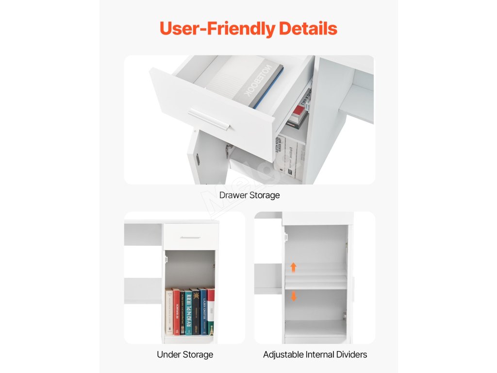 Tento písací stôl so zásuvkami so sviežou bielou povrchovou úpravou, doplnenou prírodným hnedým umelým drevom a elegantnými čiernymi kovovými nohami, poskytuje elegantný a moderný vzhľad, ktorý sa hodí k akémukoľvek štýlu zariadenia domácnosti.