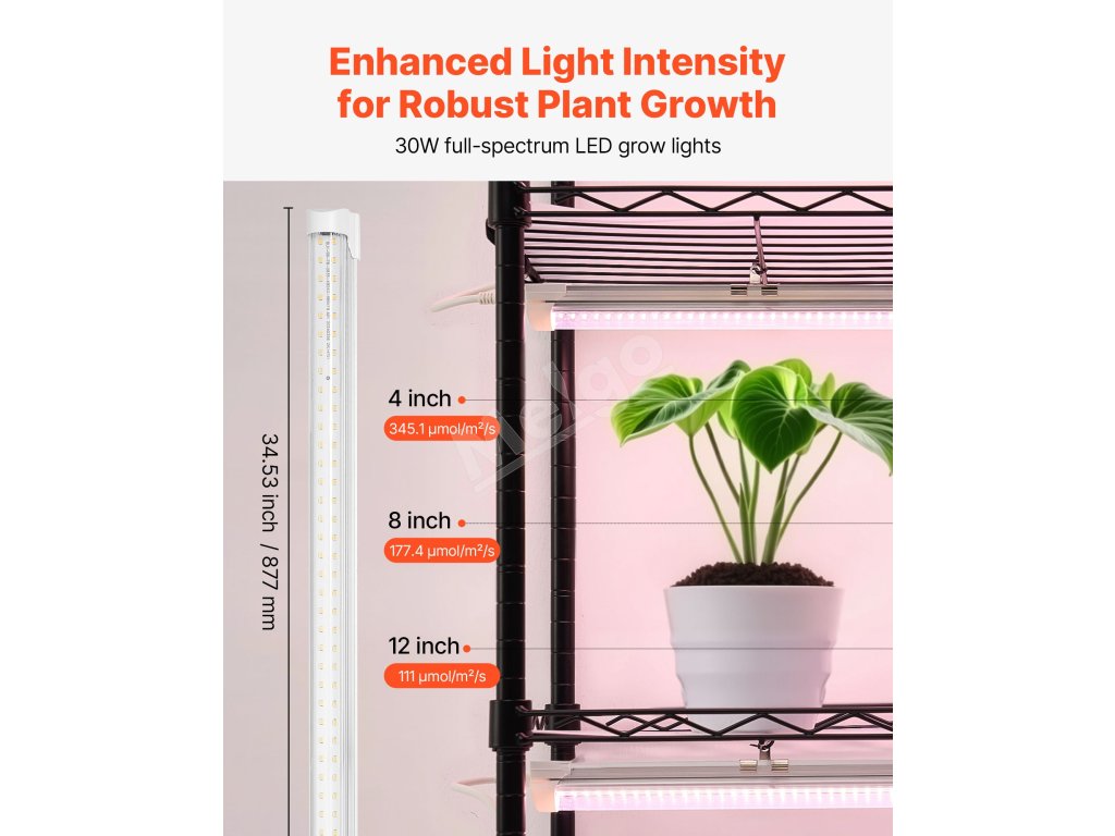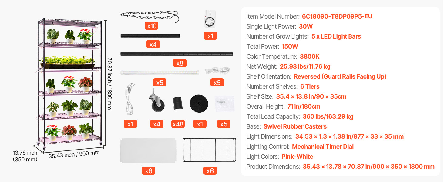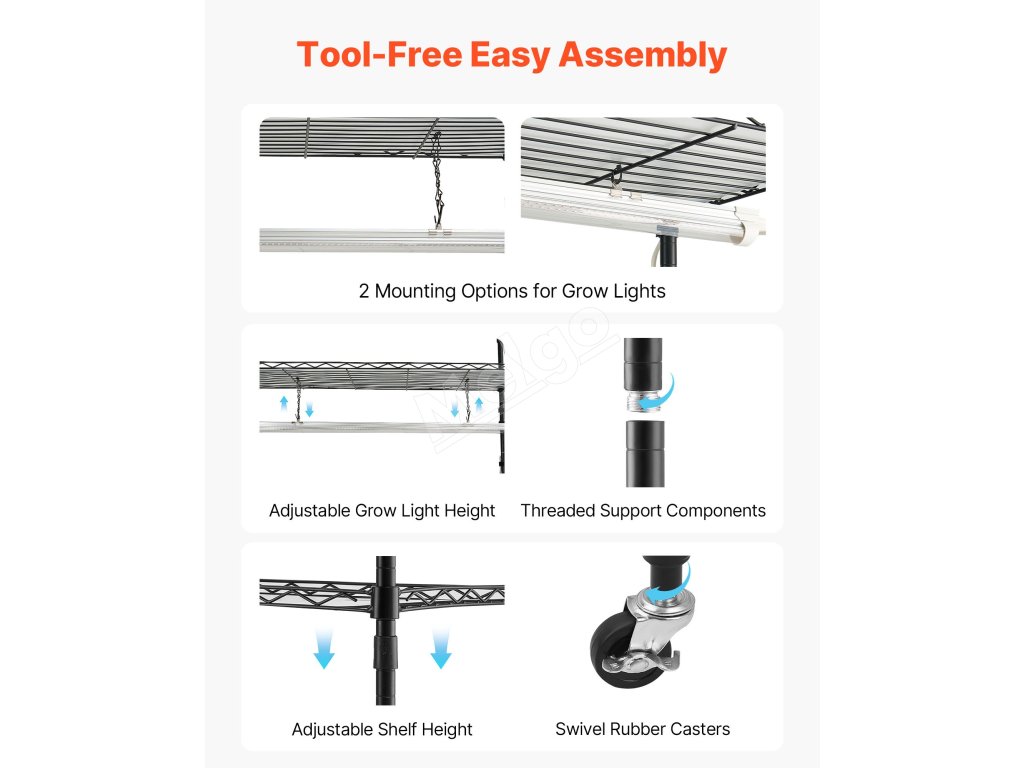 Polička na pestovateľské osvetlenie Obsahuje všetko príslušenstvo a zrozumiteľné pokyny. Nie je potrebné žiadne náradie ani zložité kroky - rýchlo nastavte a užívajte si záhradkárčenie v interiéri bez stresu.