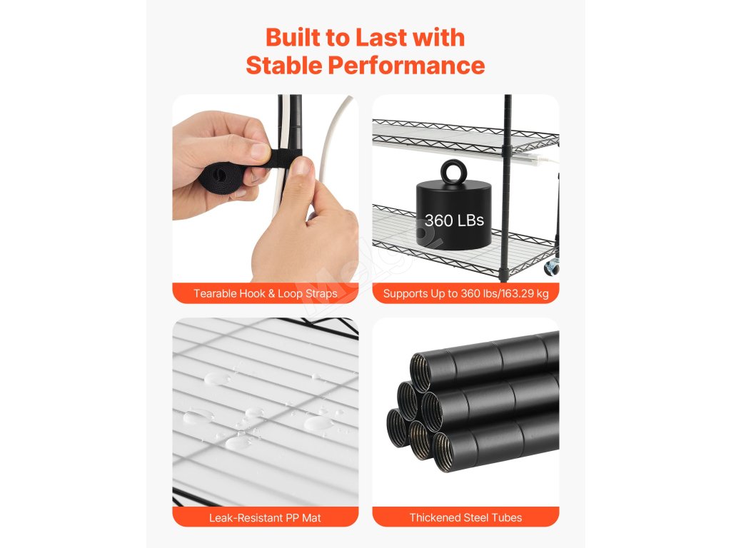 Nastaviteľné police sa hodia pre rastliny rôznej výšky. popruhy s háčikmi a slučkami udržiavajú rastliny v bezpečí, nepriepustné zásobníky z PP chránia obvody a otočné gumové kolieska umožňujú bezproblémové premiestňovanie.