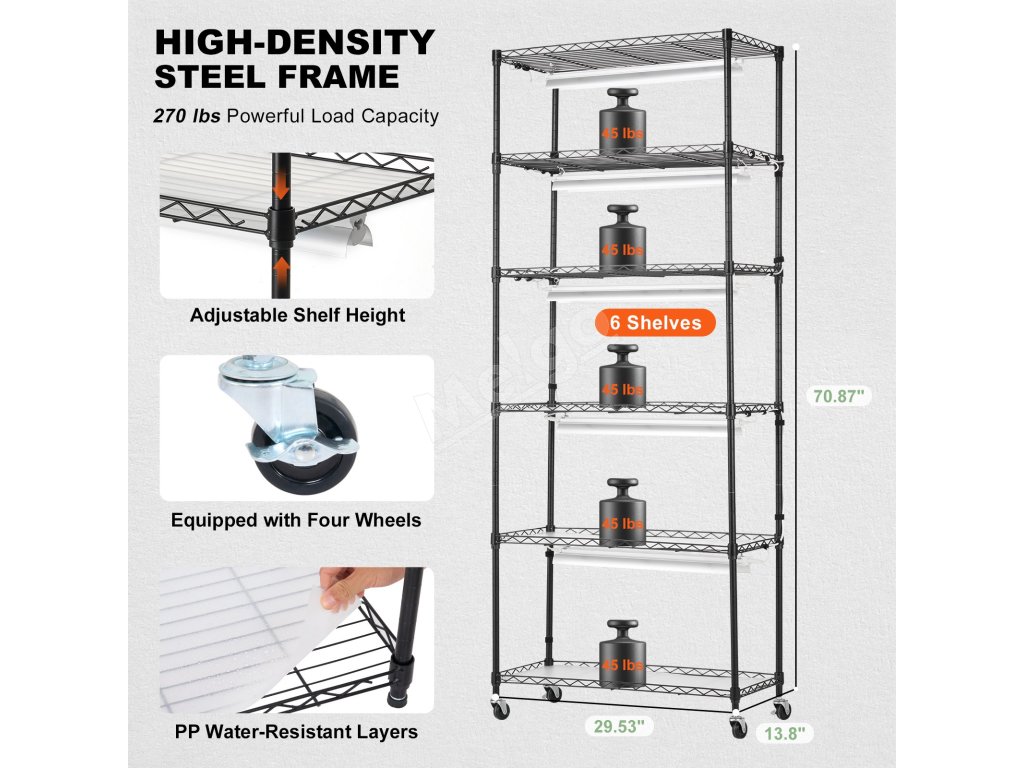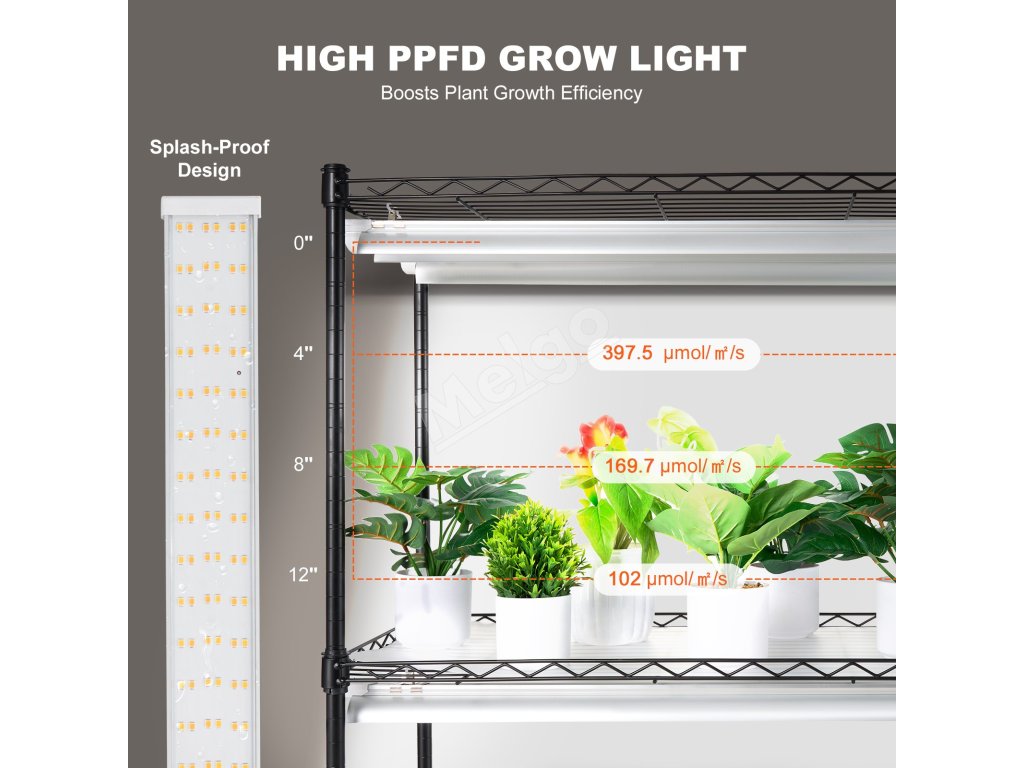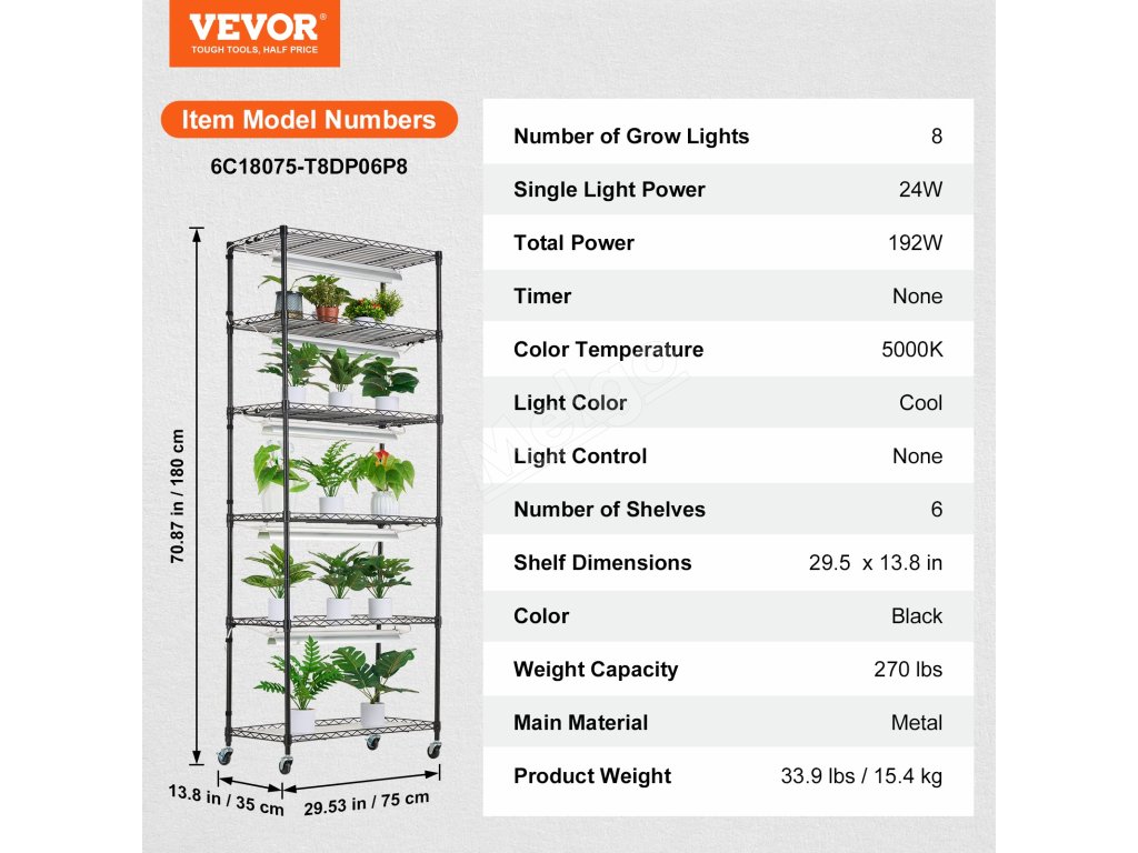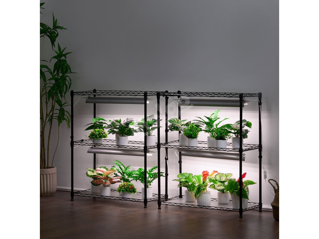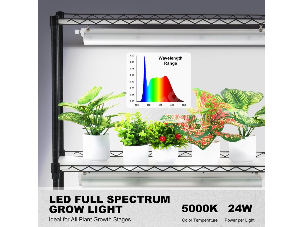 Tento stojan na rastliny pre domácich majstrov je vybavený 192W LED panelmi s plným spektrom 400-780 nm. Stojan na rastliny so 6 policami, ktorý je vyrobený z ocele s vysokou hustotou pre odolnosť proti hrdzi a oxidácii, má rozmery 29,5 x 13,8 x 70,9 palca. Stojan na rastliny s nosnosťou 270 kg ponúka dostatok priestoru a opory pre rastliny.