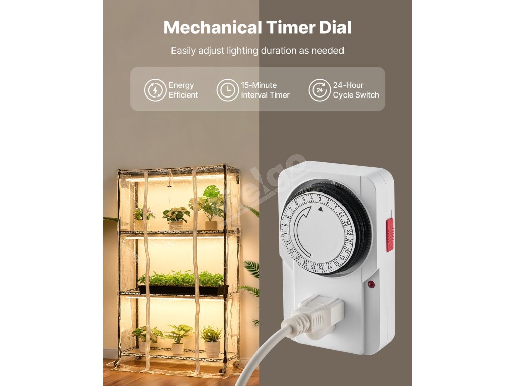 Jednoduchý otočný časovač vyžaduje len jedno nastavenie pre denné automatické cykly zapnutia/vypnutia. Dokonca aj počas cestovania dostanú vaše rastliny stálu starostlivosť bez obáv.
