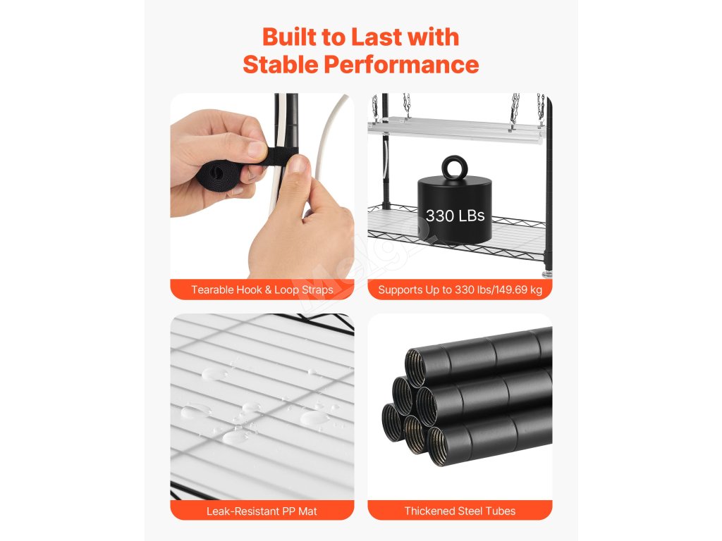 Nastaviteľné police sa hodia pre rastliny rôznej výšky. popruhy s háčikmi a slučkami udržiavajú rastliny v bezpečí, nepriepustné zásobníky z PP chránia obvody a otočné gumové kolieska umožňujú bezproblémové premiestňovanie.