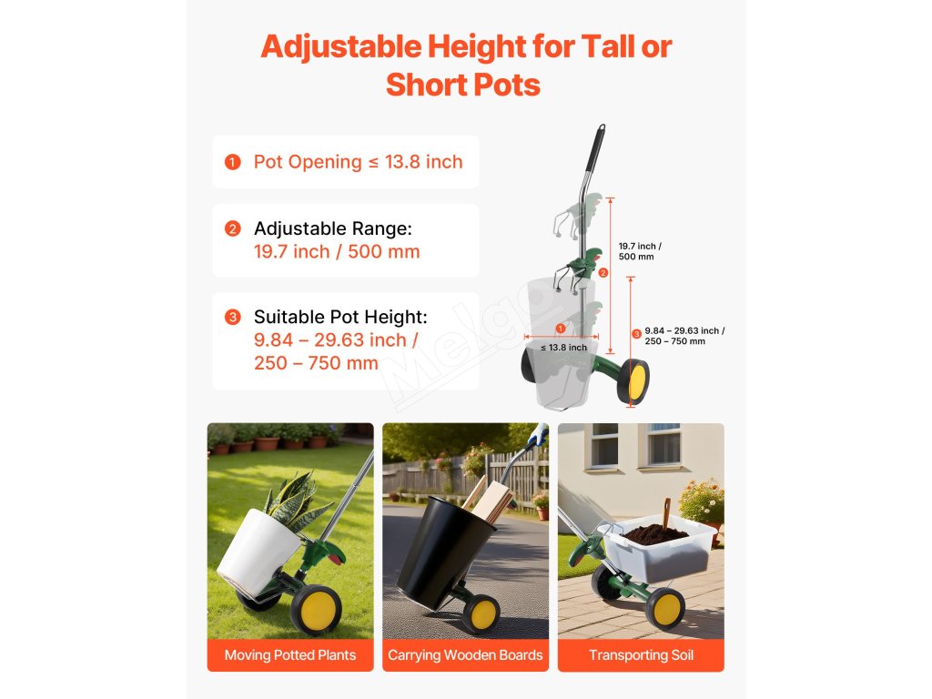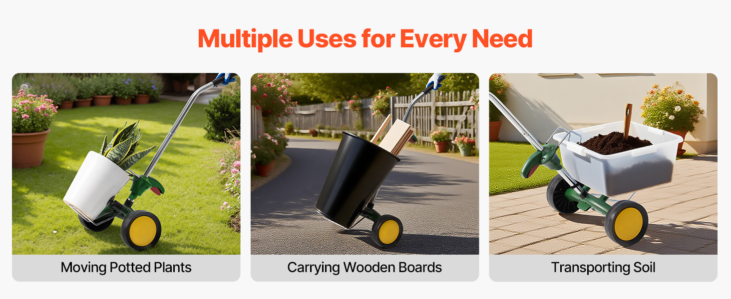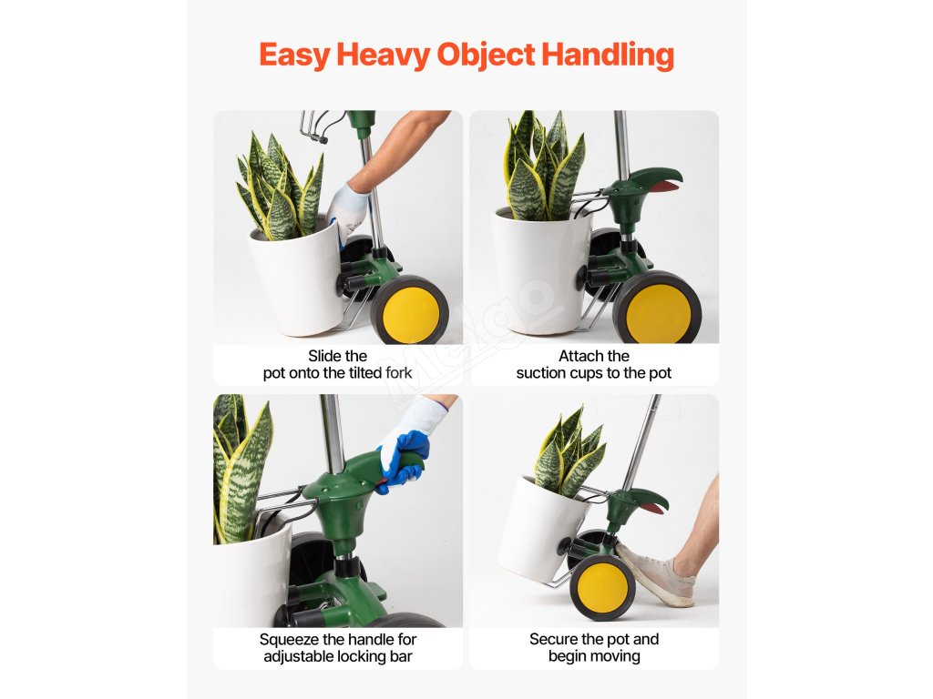 Tento vozík na črepníkové rastliny je ideálny na umiestňovanie a premiestňovanie rastlín v záhradách, na balkónoch alebo vo veľkých vnútorných priestoroch. Hodí sa aj na premiestňovanie odpadkových košov, doručovacích krabíc, balenej vody a iných ťažkých predmetov.